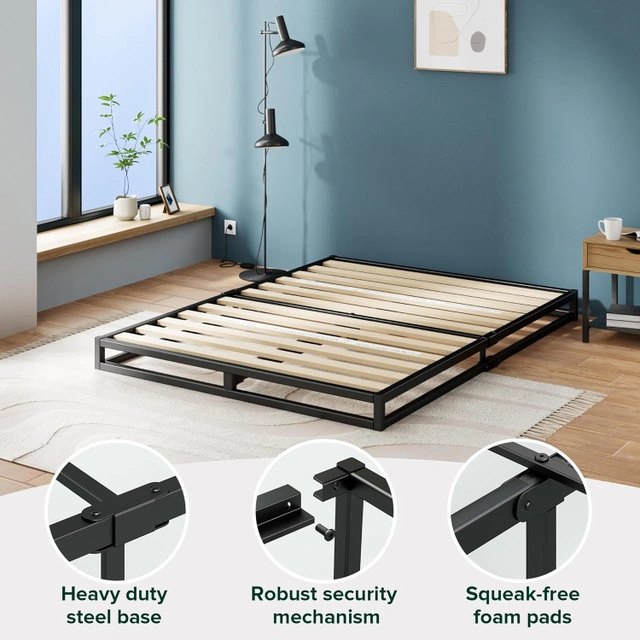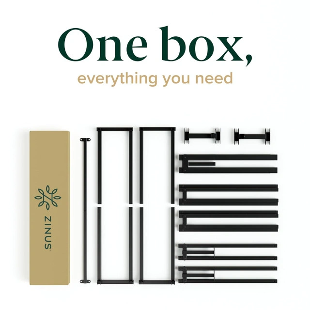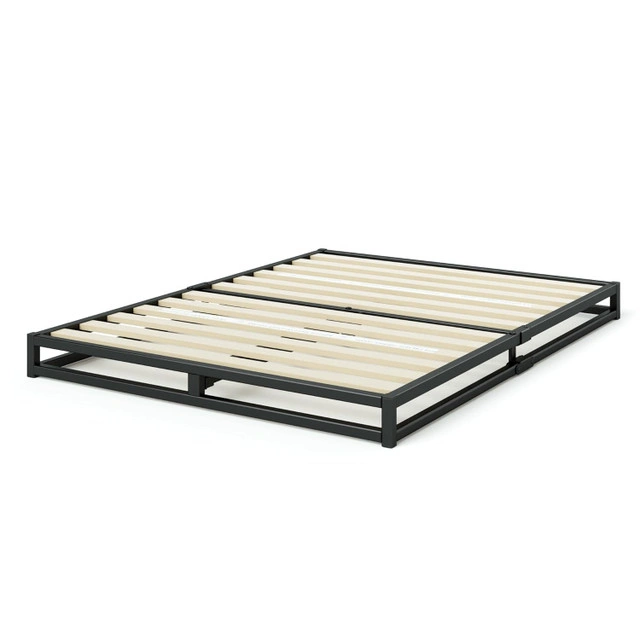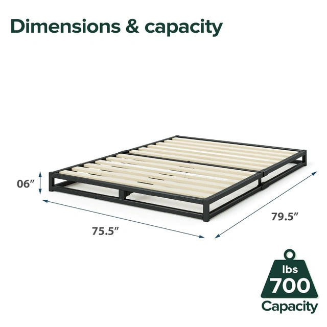 Brand new bed frame. It comes unassembled in original box with all manufacturer parts and hardware for easy assembly. Pickup from south London. I can deliver in London for an extra fee. Zinus King Bed Frame - Joseph 6 Inch Metal Bed Frame with Wood Slat Support, No Box Spring Needed, Easy Assembly - Minimalist Platform Bed Frame, King Size Product details: SizeKing Material: Steel Plywood Product Dimensions: 2.02L x 1.92W x 0.15H Meters Style: 6 Inch Special feature: No Box Spring Needed ColourBlack GO MINIMALIST - Less is more, especially with this modern and structurally sound foundation that lends both strength and understated sophistication to your bedroom - two qualities that never go out of style LOW PROFILE – 6 inch platform height is perfect for taller mattresses or for those who prefer their bed lower to the ground; twin size supports a maximum weight capacity of 350 lbs, while all other sizes can support up to 700 lbs NO BOX SPRING NEEDED - Reliable wood slats are designed to support and extend the life of your latex, memory foam or spring mattress without the need for a box spring; slats are spaced 3 - 3.4 inches apart EASY ASSEMBLY - All parts, tools and instructions are shipped straight to your door in one efficiently packed box for simple set-up that takes less than hour with a friend’s help