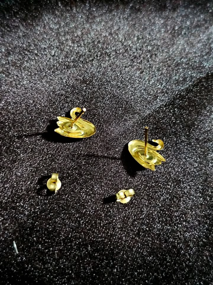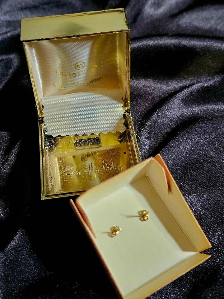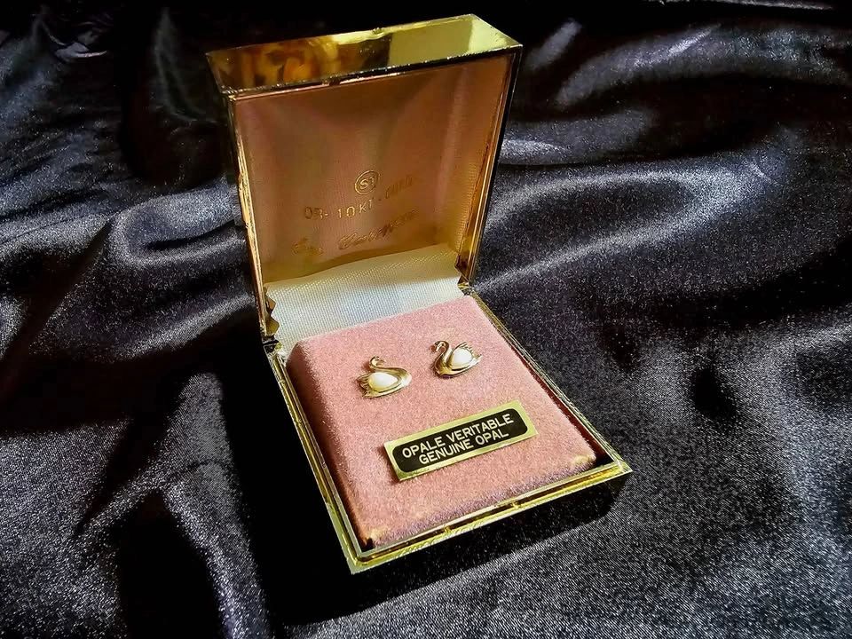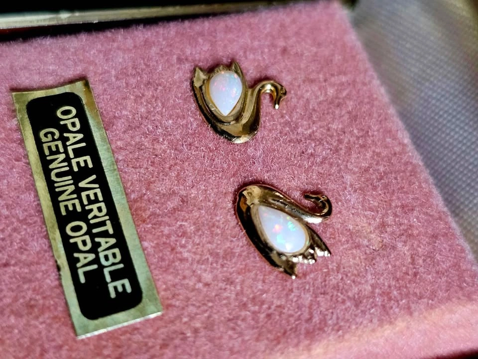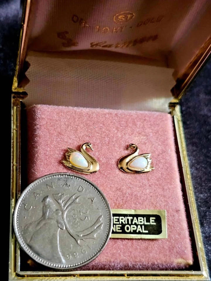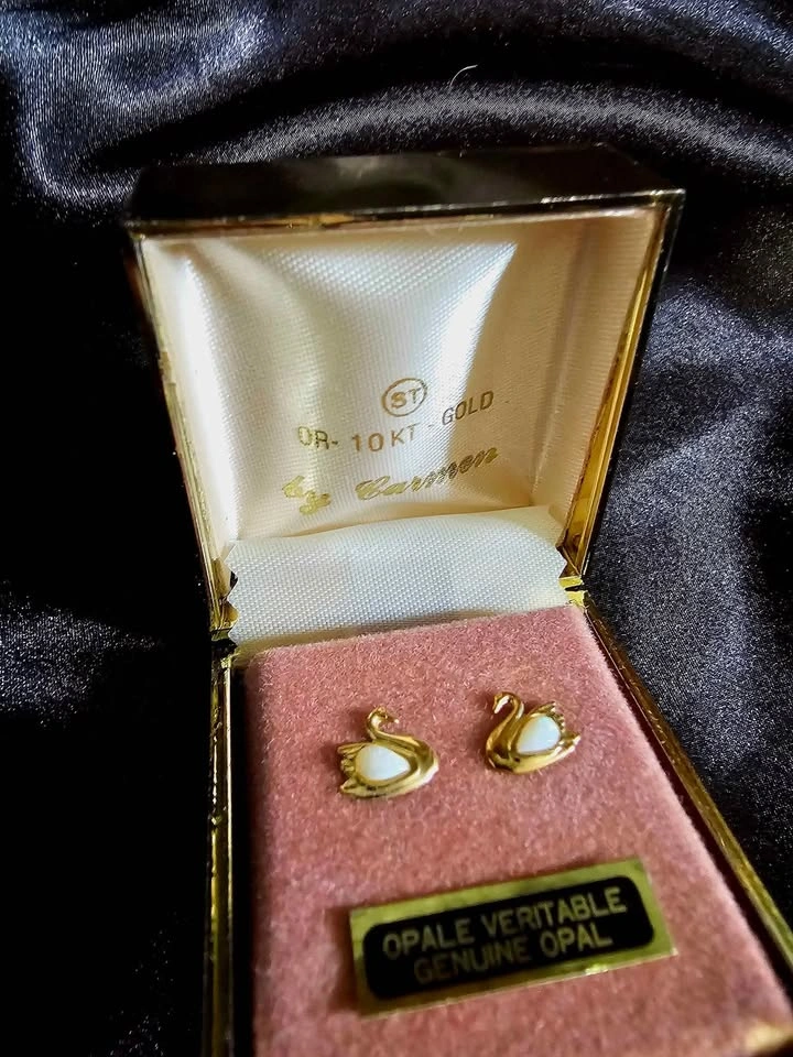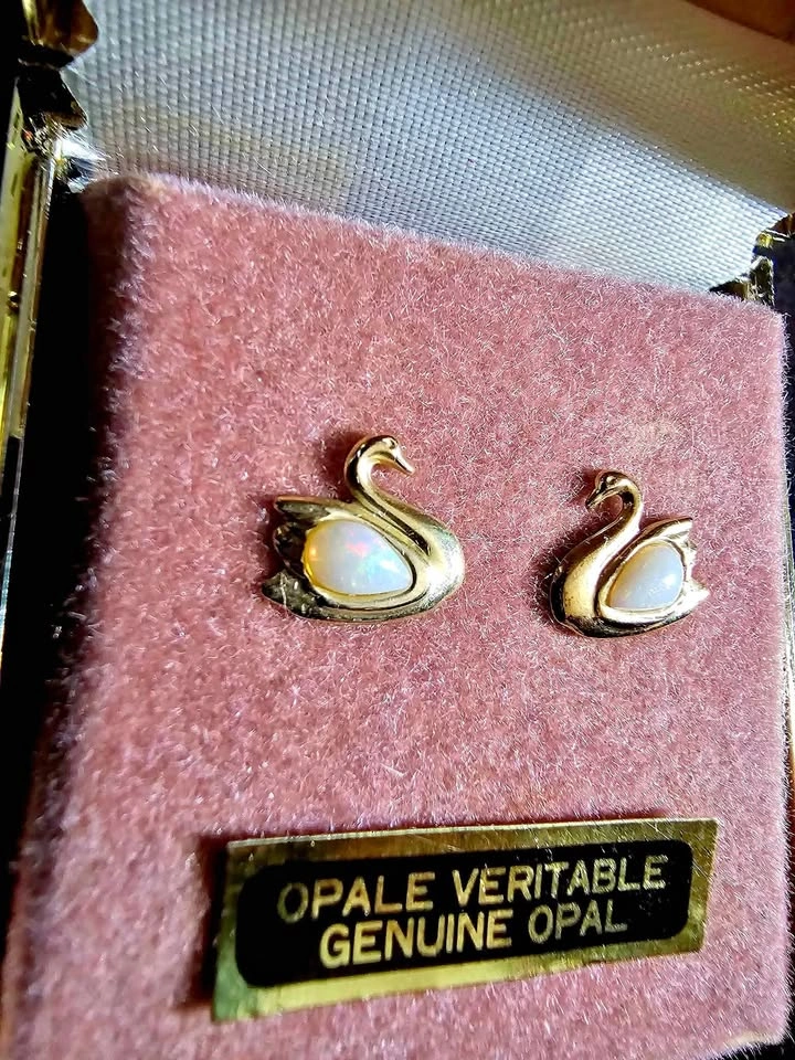 Brand new in box, vintage 10K solid gold swan stud earrings featuring genuine opal teardrop shaped stones. These dainty and feminine earrings are perfect for adding a subtle and sophisticated touch to any look. Earrings come in the original gold tone plastic gift box. Earrings measure about 1cm wide by 8mm tall. Shown with quarter for size reference. They are stamped on the earring backs, and the earrings have been tested with an acid test to confirm they are 10K. Made by the brand Carmen. Perfect as a gift or to keep for yourself!