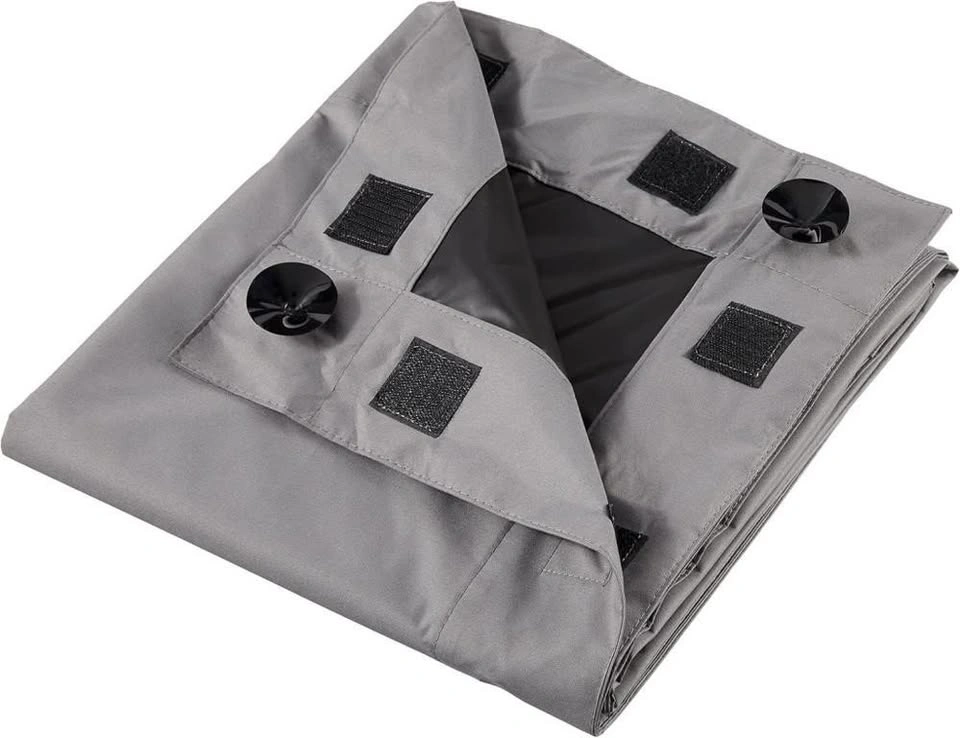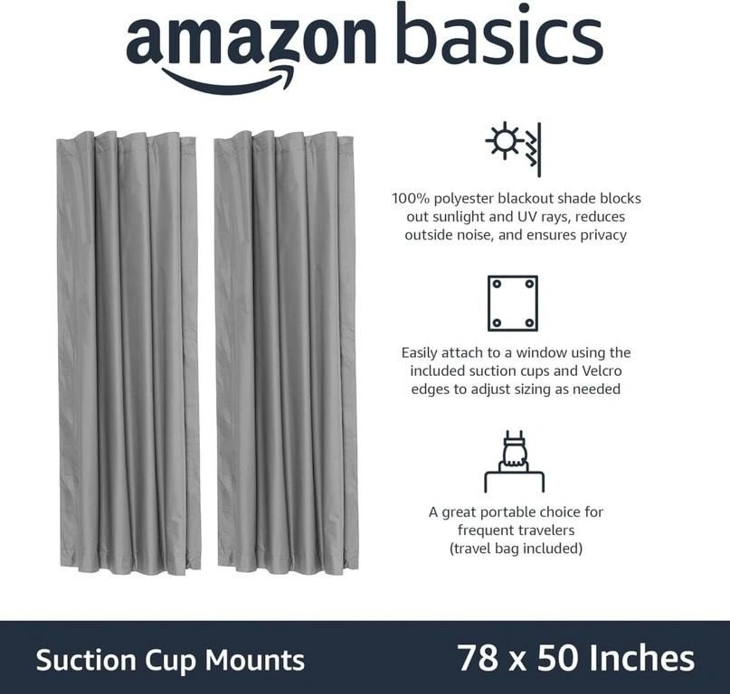 Portable blackout curtain window shade (2 panels), plus travel bag; blocks sunlight and UV rays, reduces outside noise, acts as an energy-saving insulating barrier, and ensures privacy Made of 100% polyester fabric in Dark Gray; Velcro edges allow for customizing the dimensions of the curtain to fit various window sizes Machine wash cold and line dry; do not bleach, iron, or dry clean Suction cups affix to a window for easy installation; cannot be mounted to a curtain rod; be sure window is clean and suction cups are dry before installation Product Dimensions: 78 x 50 inches (LxW, per panel)
