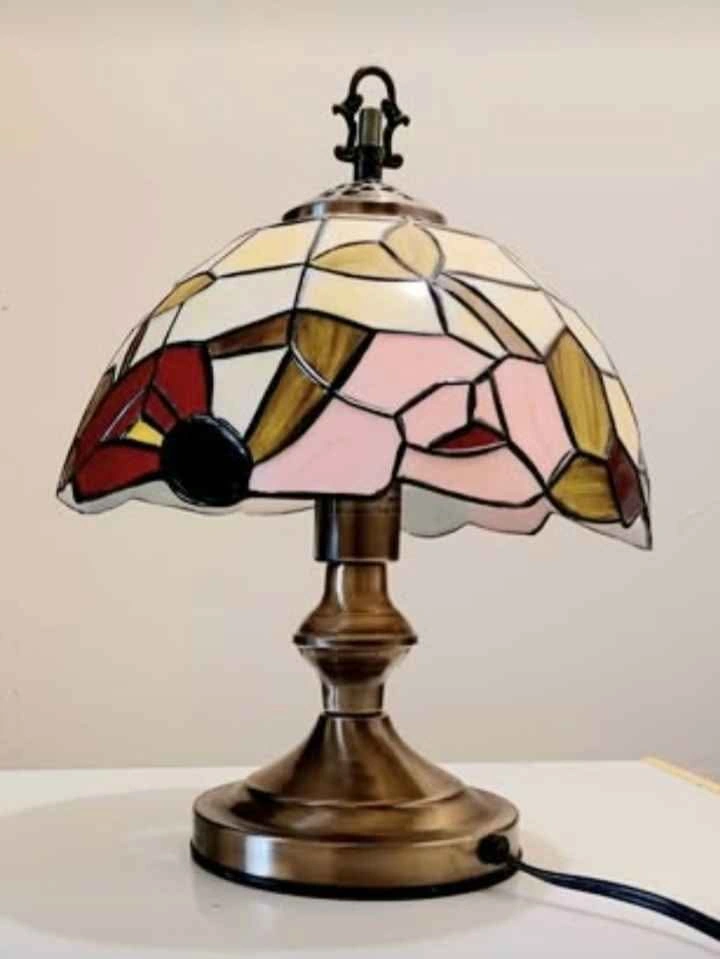 Tiffany-style Table Lamp showcasing a Colorful, geometric pattern. Base with an antique bronze finish. Diameter of shade 10 inches. Designed to provide warm, ambient lighting, suitable for bedrooms, living rooms, or offices. Excellent Condition, with Stickers. Please check out my other posts