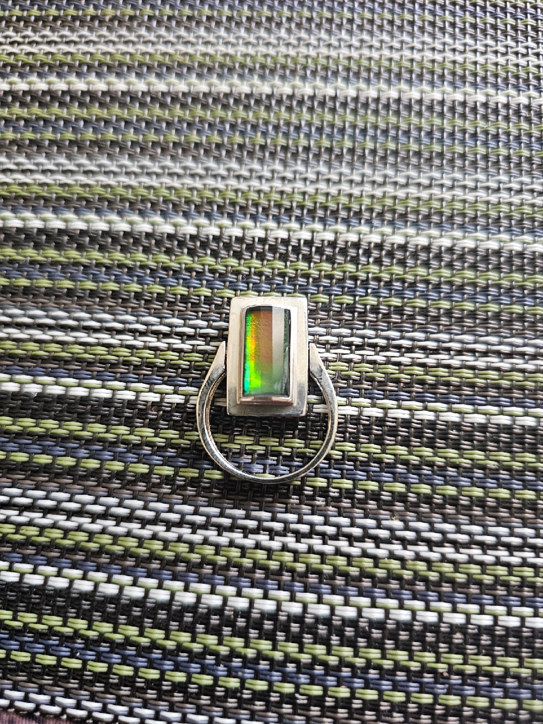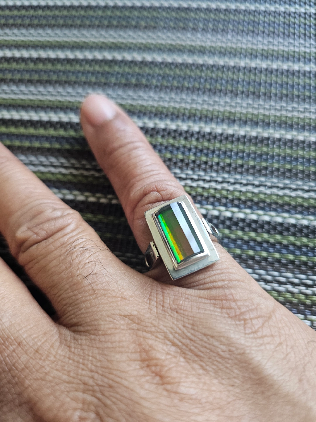 This is a beautiful ammolite ring set in sterling silver. The stone displays a lovely range of colours. It's a unique piece that would make a great addition to any jewellery collection