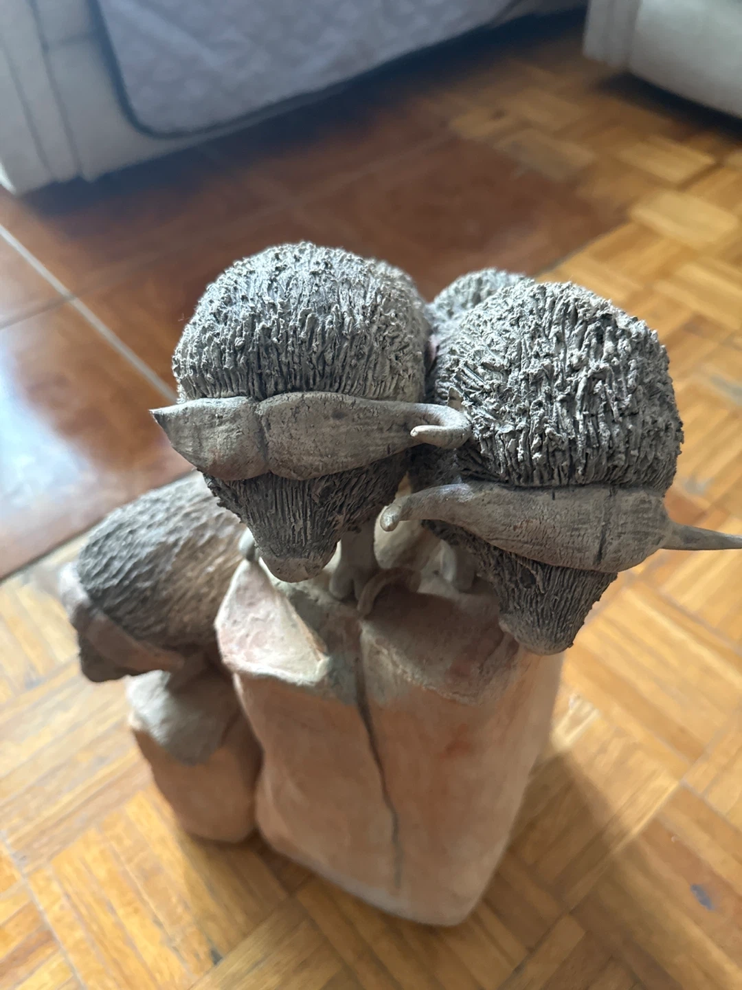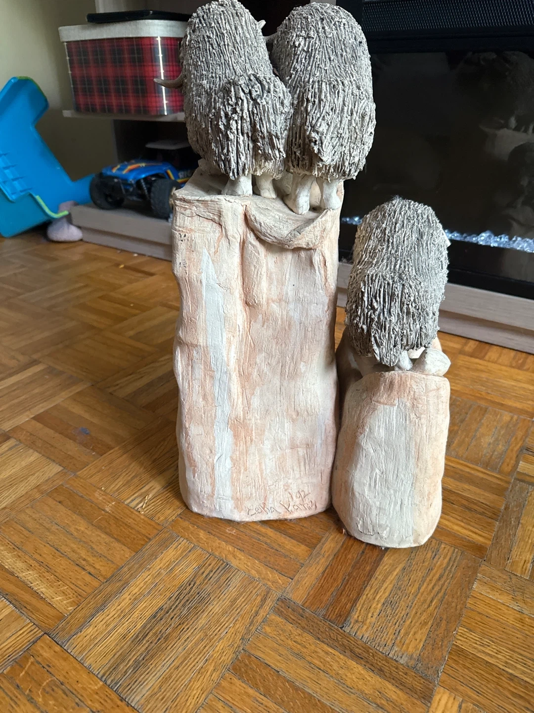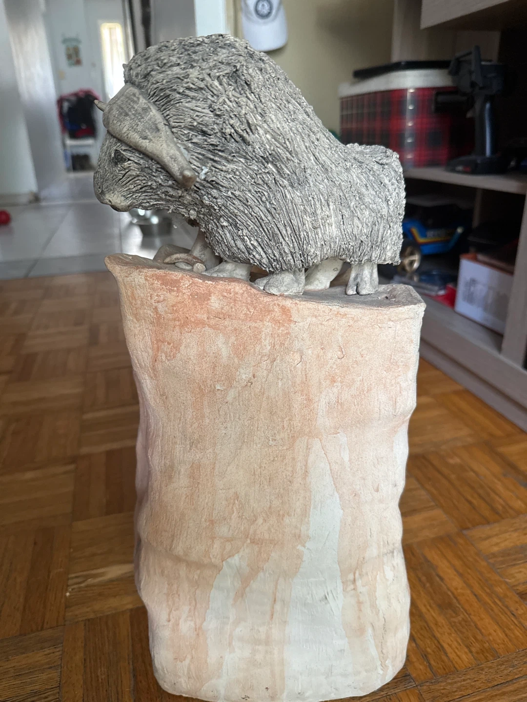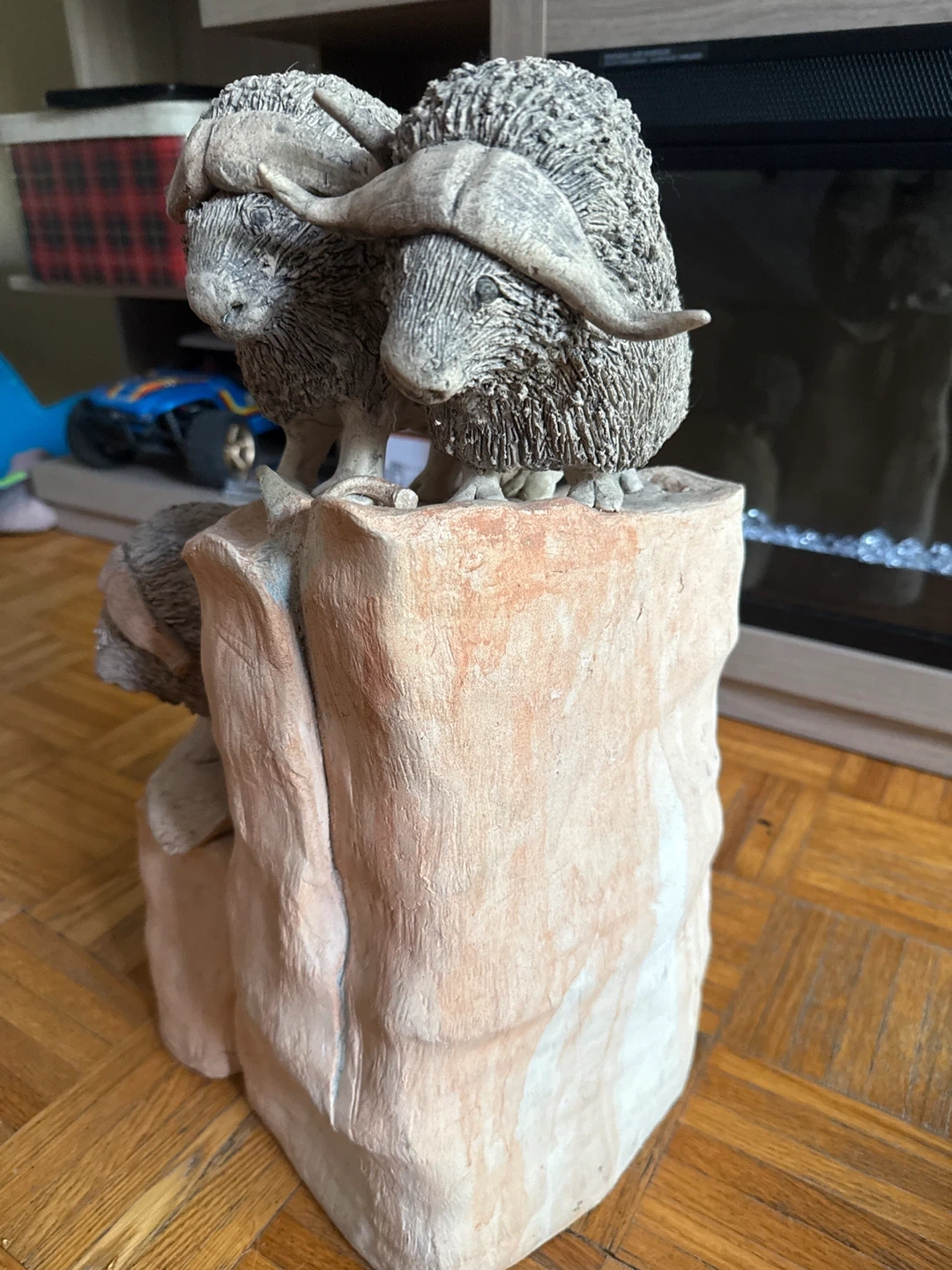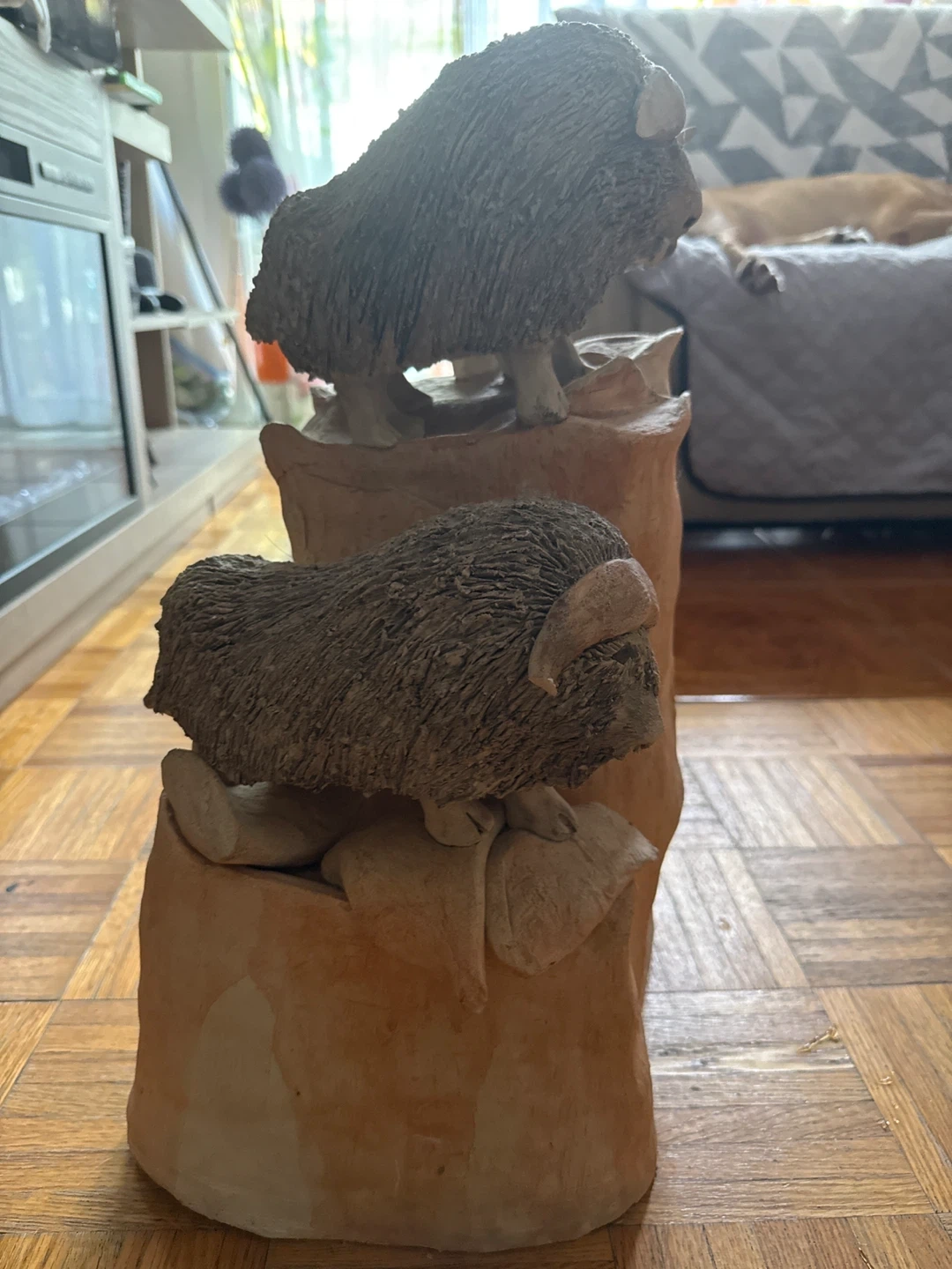 This is a muskox sculpture, perfect for adding a touch of Canadian wildlife to your home decor! It features three muskoxen standing on a rocky outcrop. A unique piece for any collector or lover of northern animals. One of them is missing the horns and the other one is missing one which I still have but haven’t had the chance to put it back.