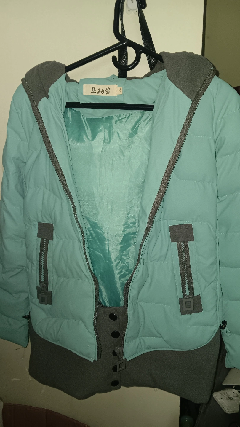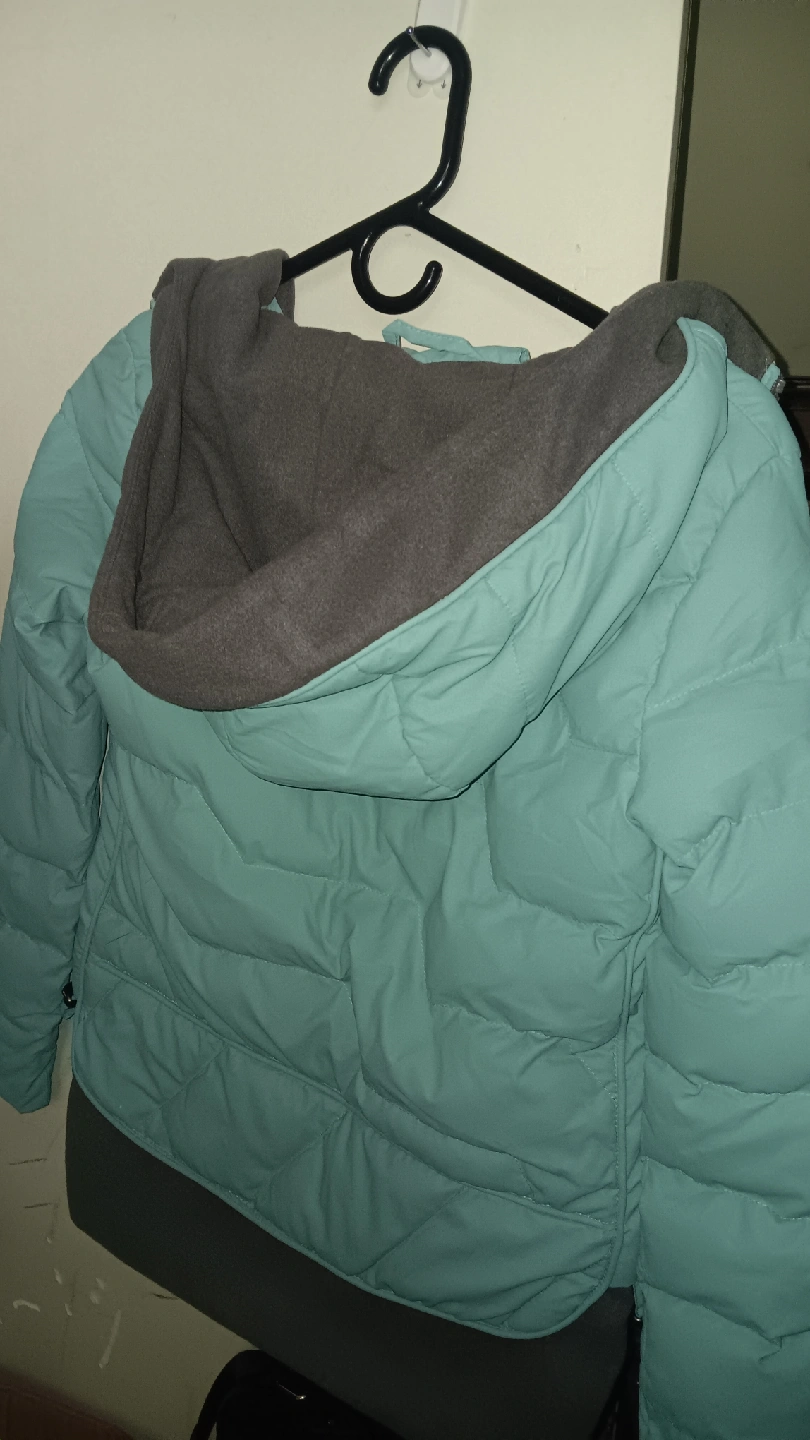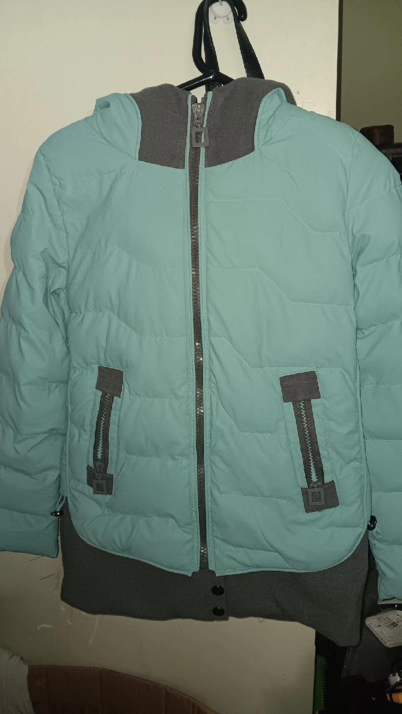 Here's a Silk Cocoon puffer jacket in a lovely mint green colour! It's a stylish and cozy option for cooler weather. The jacket features a hood and unique zipper details on the pockets. It's in great condition and ready for a new home!
