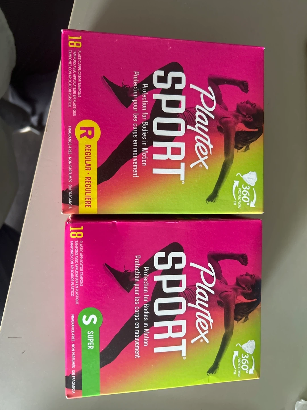 Selling two boxes of Playtex Sport tampons. One box is Regular absorbency and the other is Super absorbency. Each box contains 18 plastic applicator tampons. They're fragrance-free and designed for active bodies!