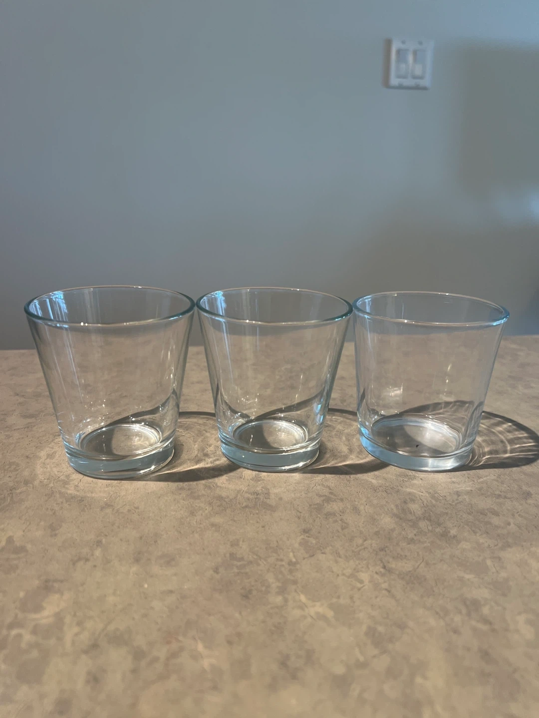 Selling a set of three clear drinking glasses. They're in great condition and perfect for everyday use. They're simple, elegant, and ready to find a new home! Can be used as candle holders, cups or charcuterie setting.