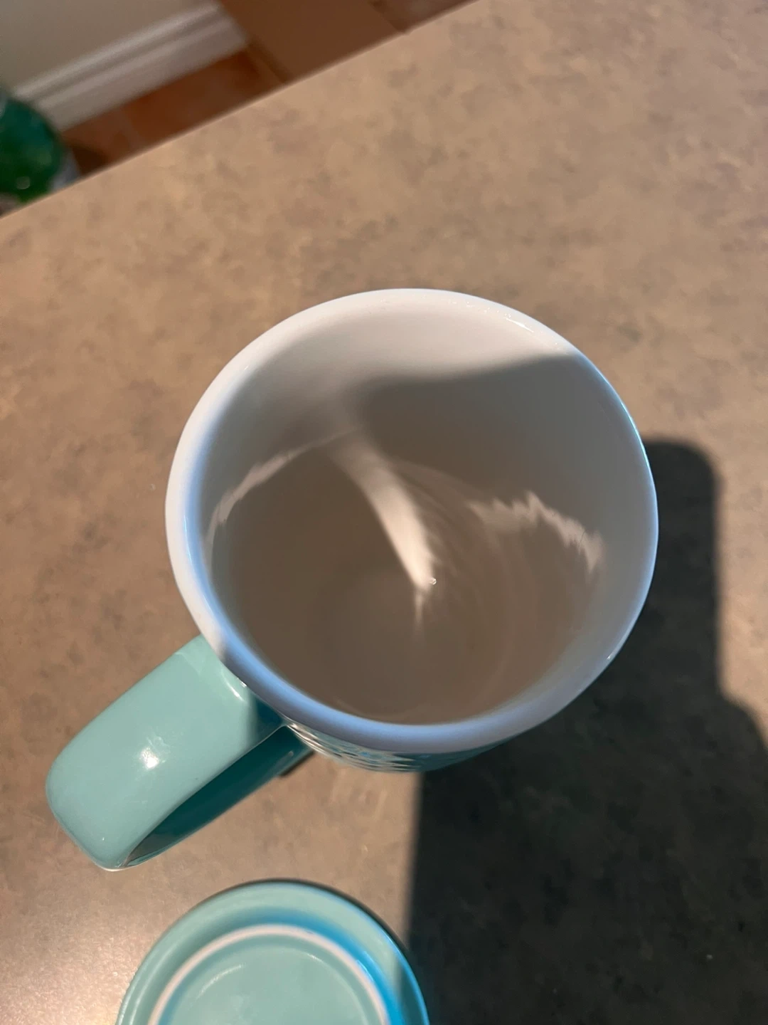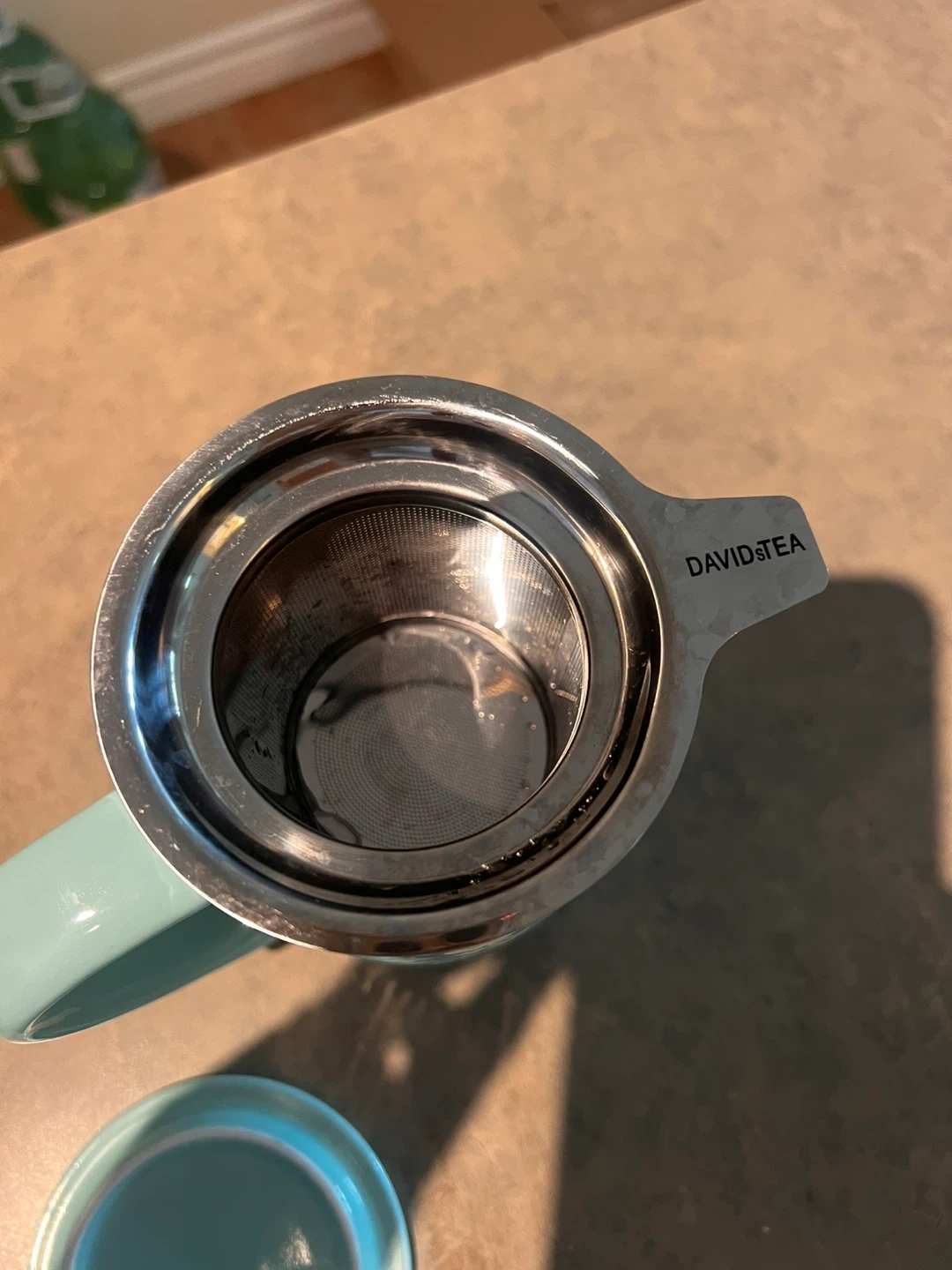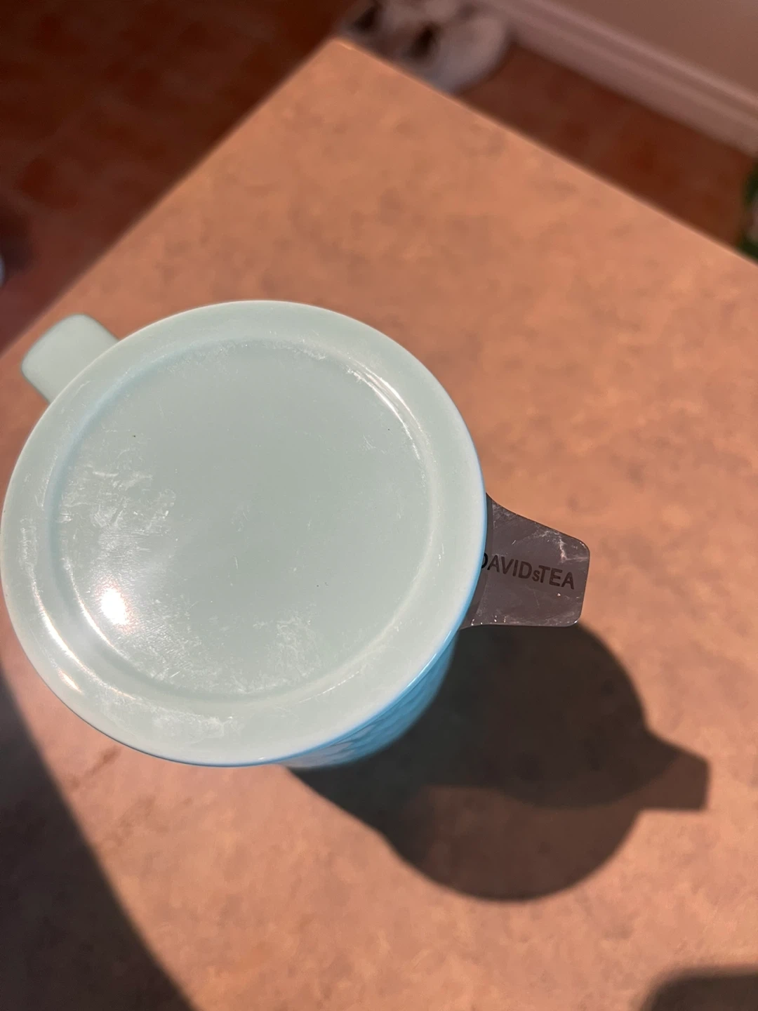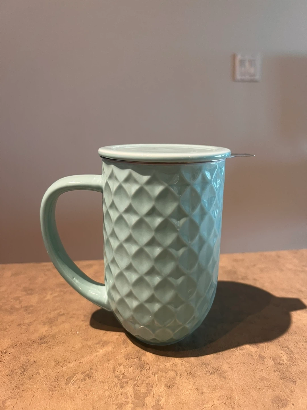 DAVIDsTEA mug in a lovely teal colour! It comes with a stainless steel infuser and a lid, perfect for brewing your favourite loose leaf teas. The mug has a textured pattern and is in great condition. Enjoy a cozy cuppa! Cash only.