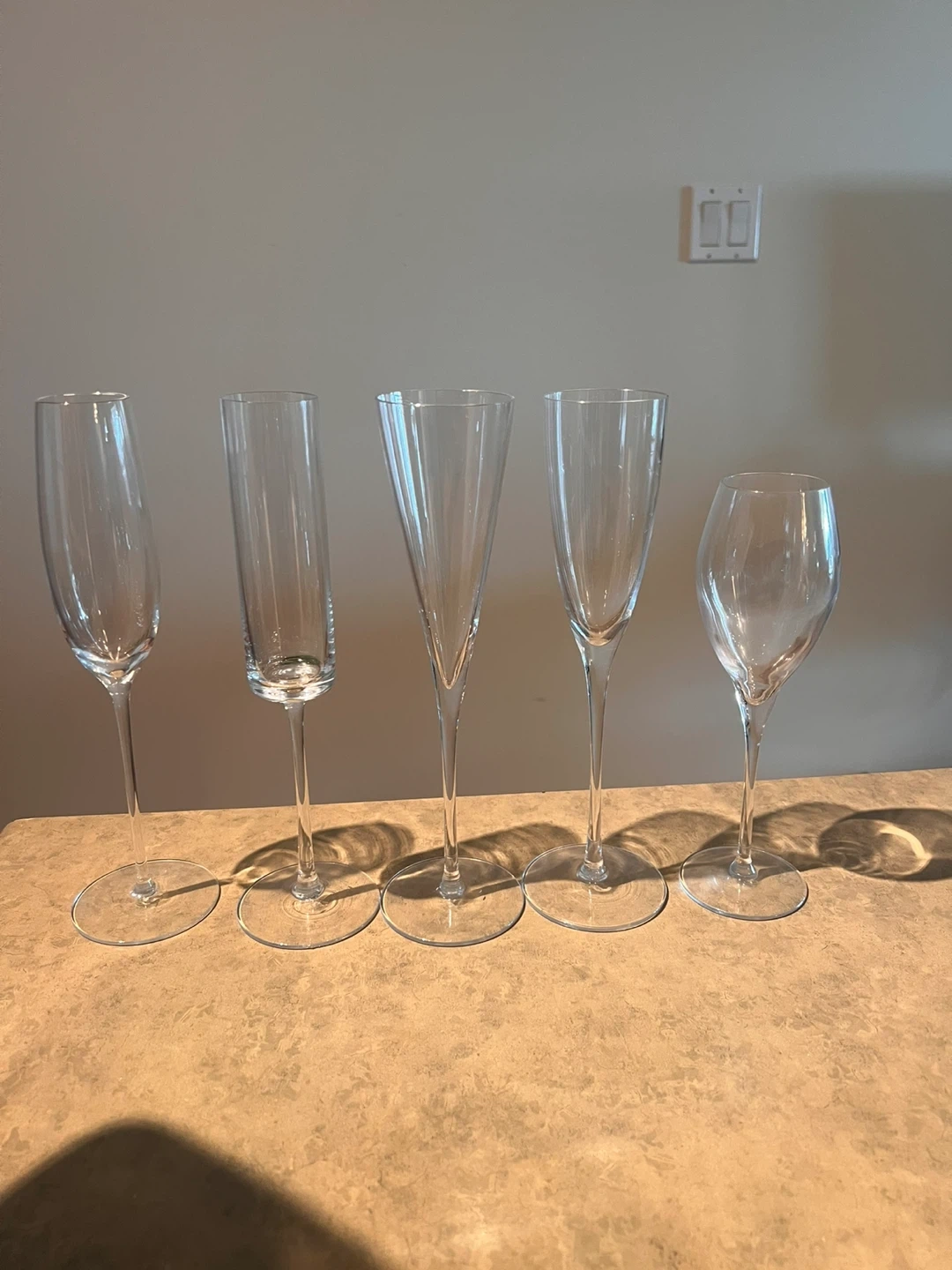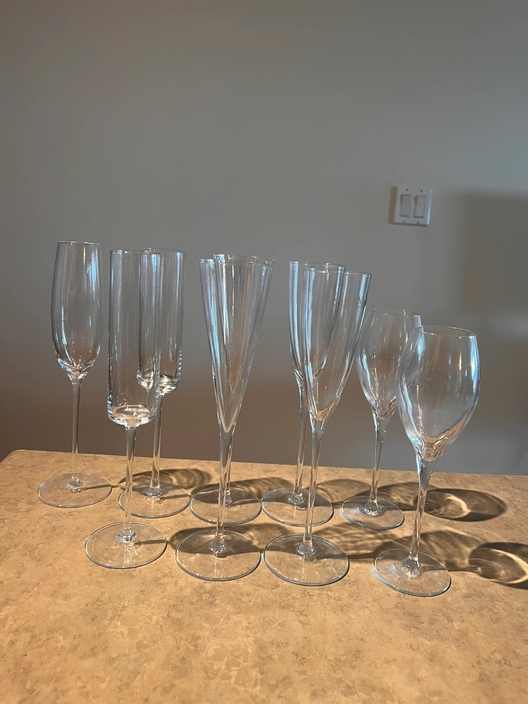 Selling a set of 9 champagne flutes. They are in great condition and ready for your next celebration! There are a few different styles included in the set. Cash only