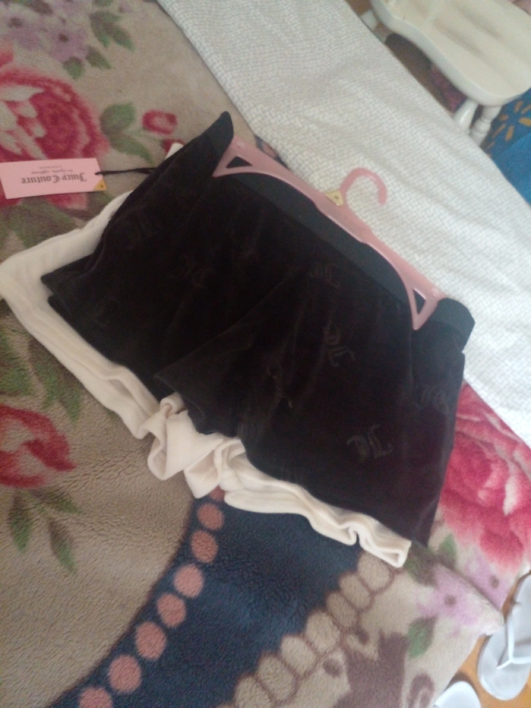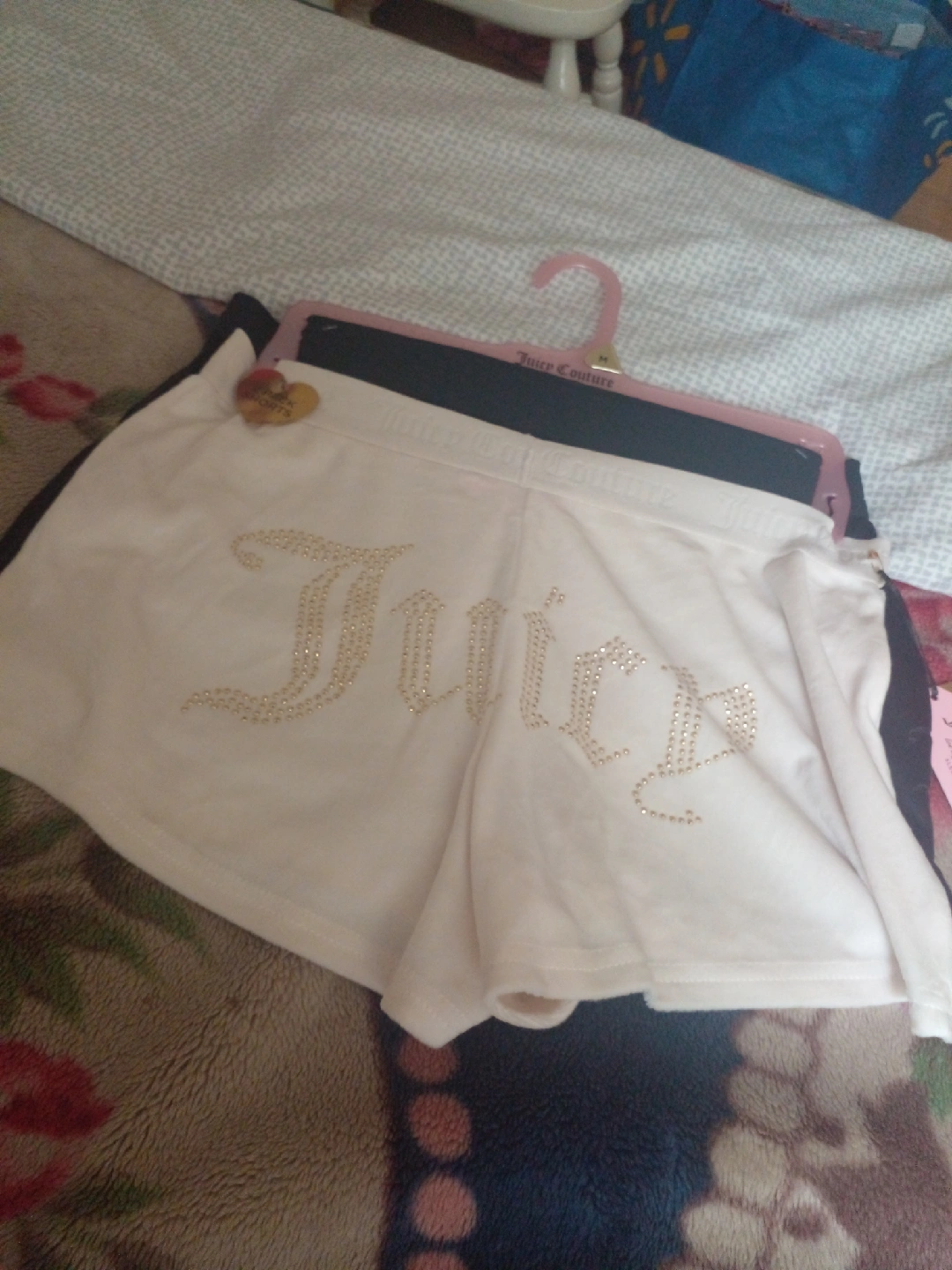 Selling a couple pairs of Juicy Couture shorts. One pair is white with the word 'Juicy' written on the front. The other pair is black. brand new