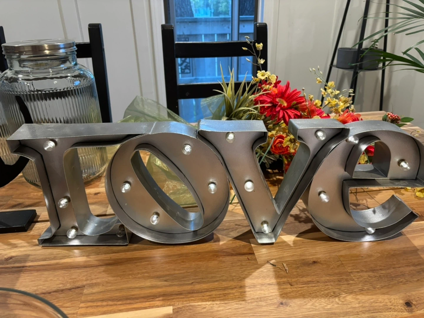 Add some love to your space with this cute marquee light-up sign! It spells out 'LOVE' in a stylish, industrial-chic font. Perfect for a bedroom, living room, or even as wedding decor. Includes 2 AA batteries. Pick up in St Boniface. Serious inquiries only, please!