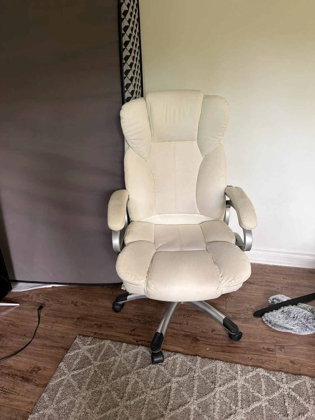 Selling a cream-coloured office chair. It's got a high back and padded armrests for extra comfort while you work! The chair has a rolling base, making it easy to move around your workspace. It has some signs of wear.