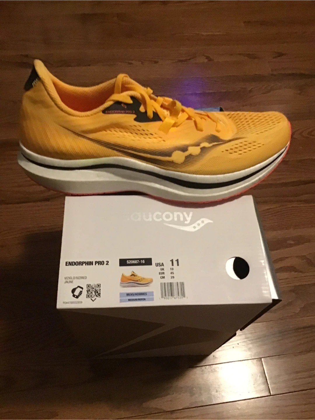 Selling a pair of Saucony Endorphin Pro 2 running shoes in yellow! They are a men's size 11. The original box is included.