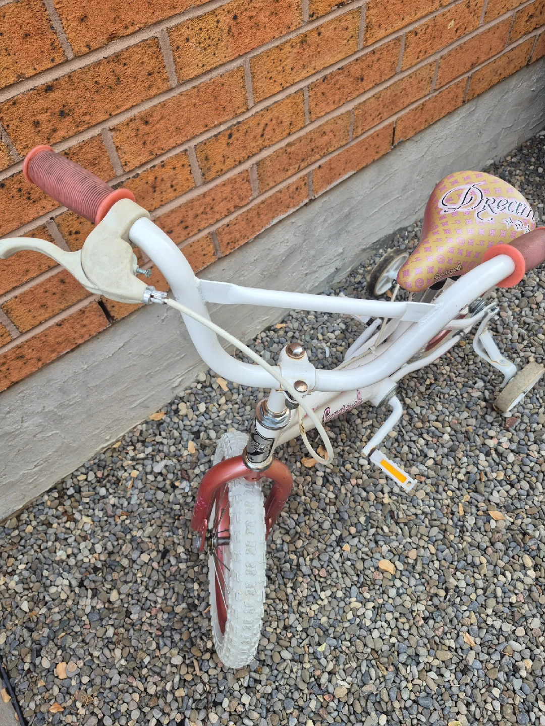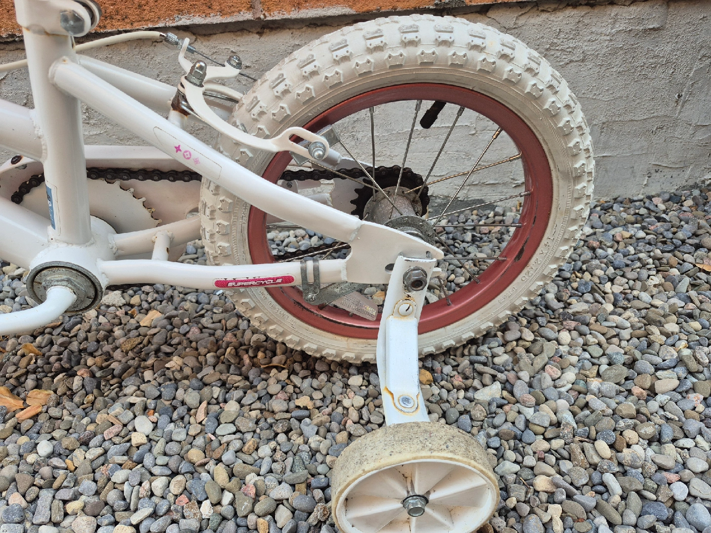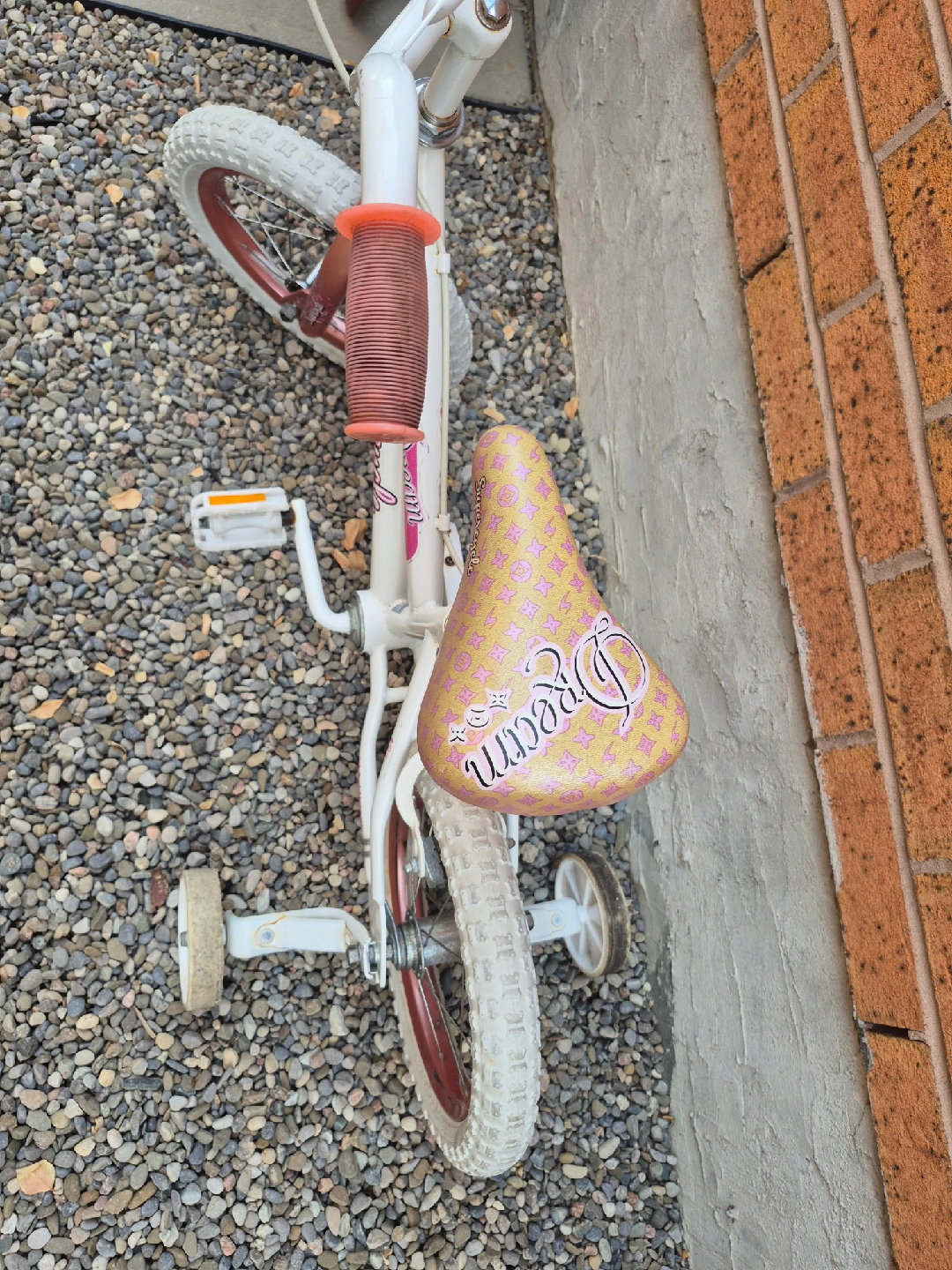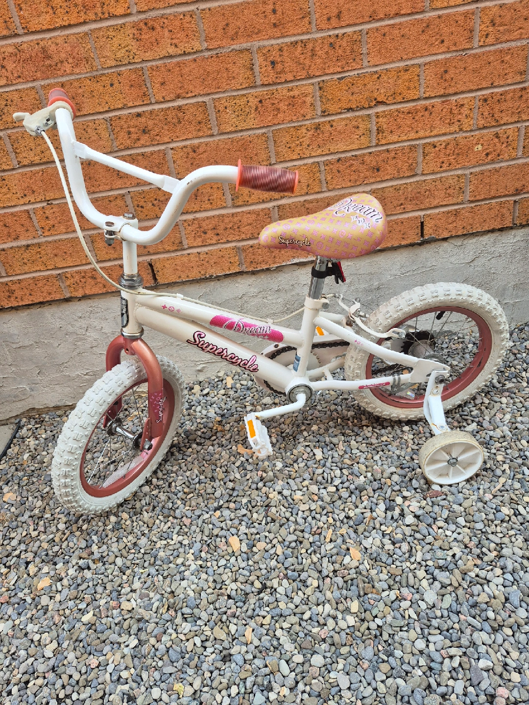 Selling a very nice Supercycle Dream kids bike! It's white with a cute patterned seat and comes with training wheels, perfect for little ones learning to ride. Great for getting your child active and outdoors. Wheels are 14 inches. Pick it up today.