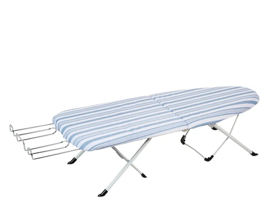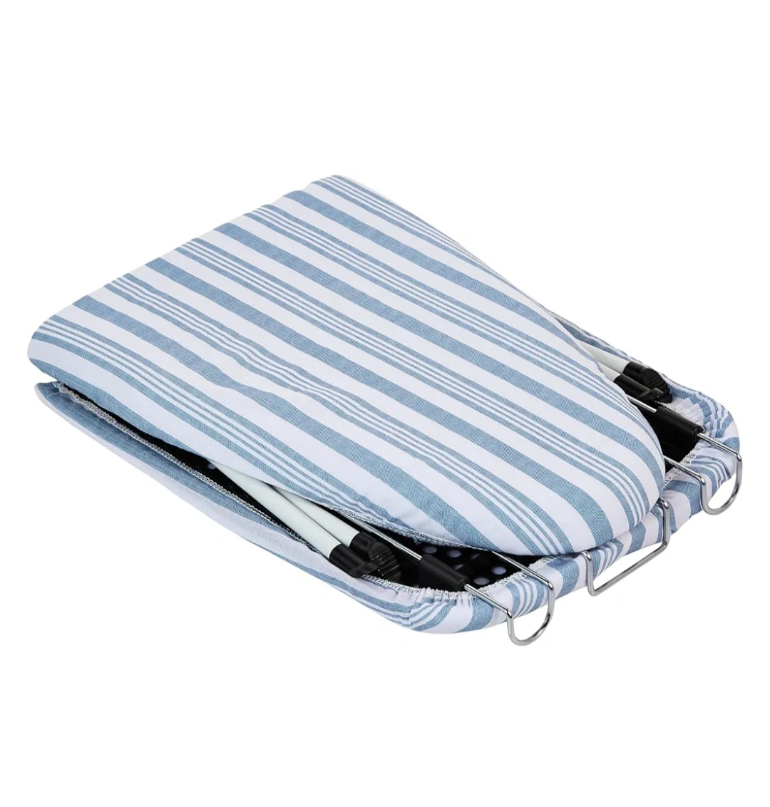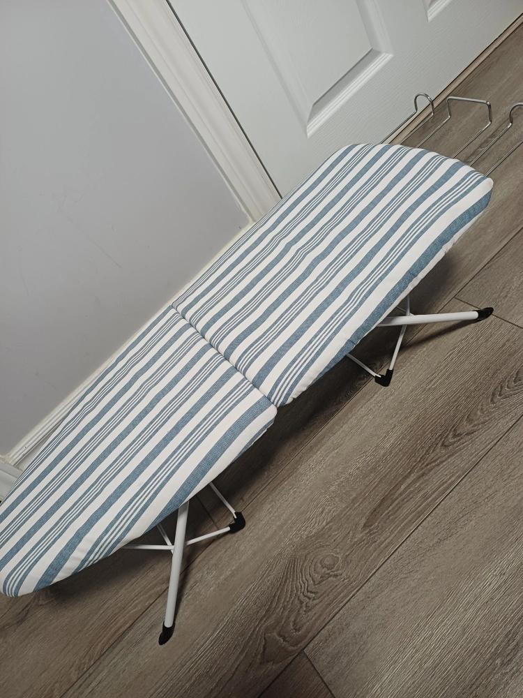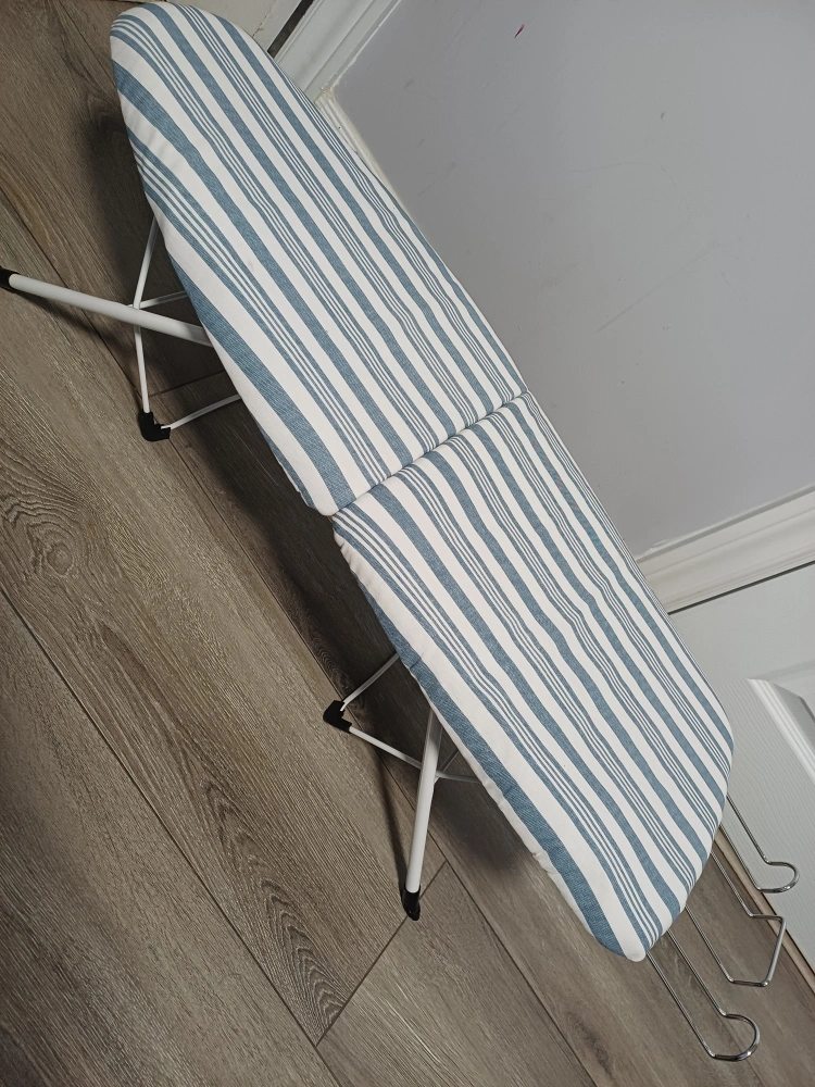 This is a portable household essential ironing board with folding legs. It features a blue and white striped cover and a metal frame. So easy to use and store. Fits conviniently in a laundry room or suitcase for travelling. Sturdy tabletop ironing board with ample ironing surface. includes metal iron rest to prevent scorching. Maximizes ironing board storage ideas. Brand new in a box😊