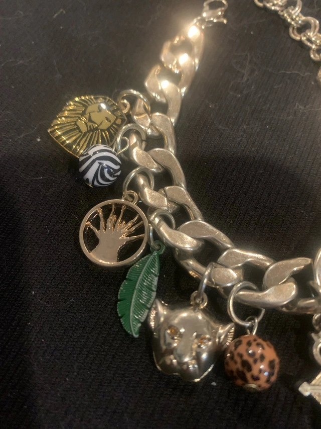 This is a deluxe Lion King themed charm bracelet with a gold chain and various Lion King themed charms. It's in good used condition, ready to add a touch of Disney magic to your outfit! This bracelet has a unique style and showcases a variety of charms from the beloved movie. Bracelets like this typically sell for around $40-$75 on Kijiji. I've priced this one at the higher end because of its unique character and good condition. If the ad is up, it's still available. Get ready to show off your love for The Lion King!