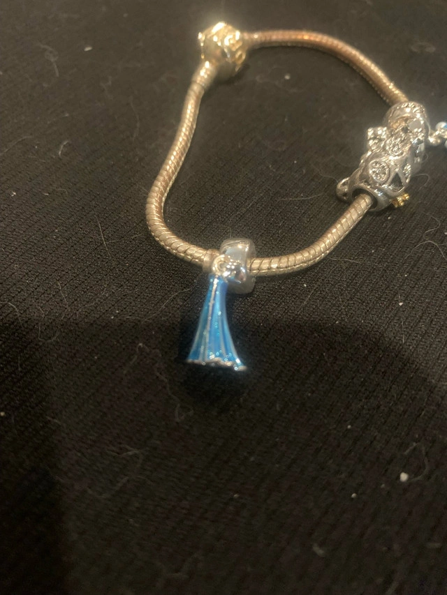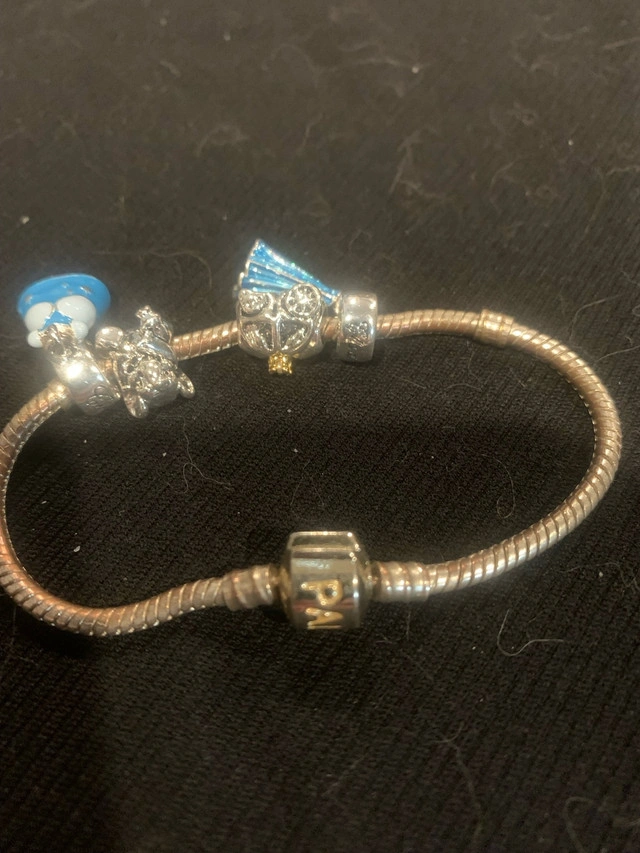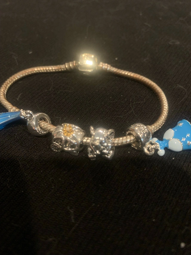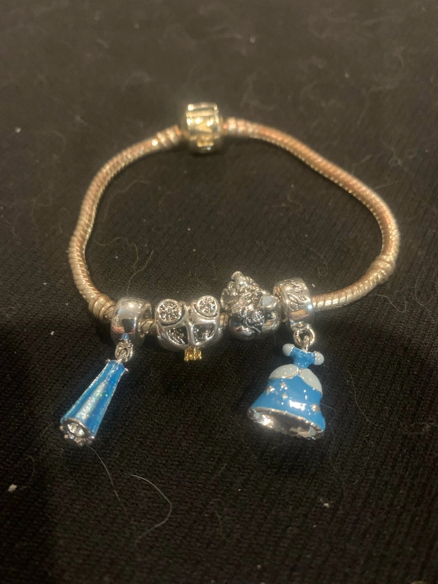 This is a used Pandora bracelet, which has been gently worn. This adorable bracelet features a collection of charms, each with its own unique design. A perfect collectable for any fan of Disney. It's looking for a new home where it can bring joy and sparkle to someone's life. If the ad is still up, it means the bracelet is still available, so feel free to reach out!