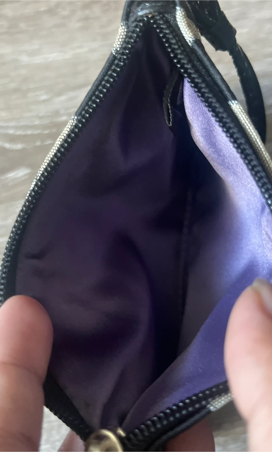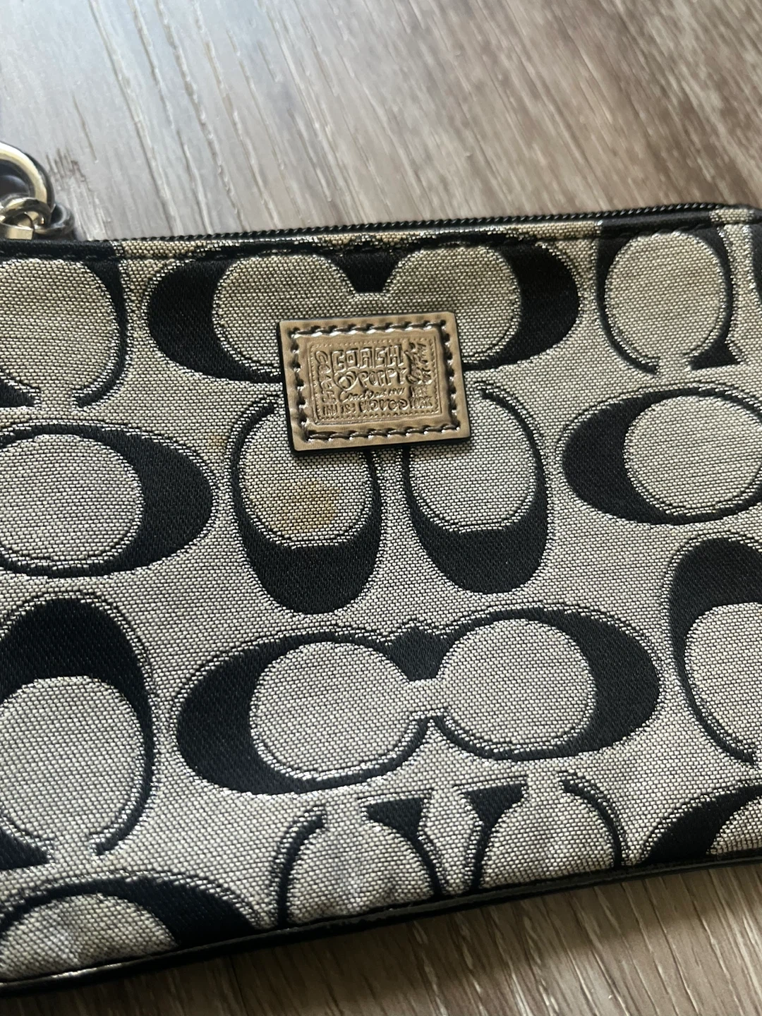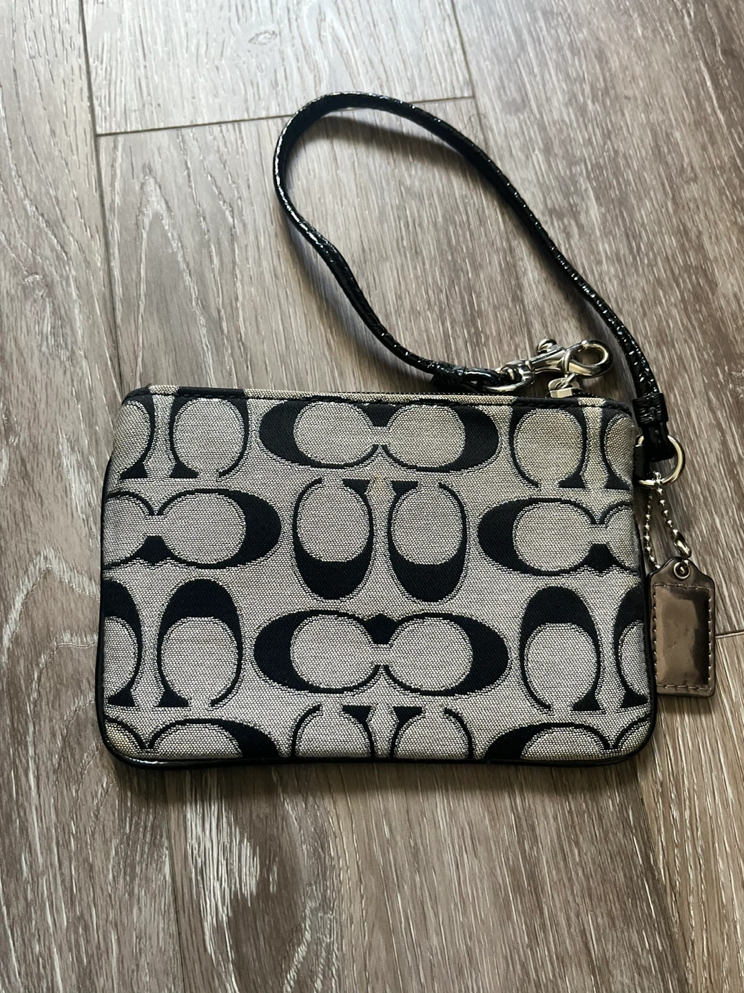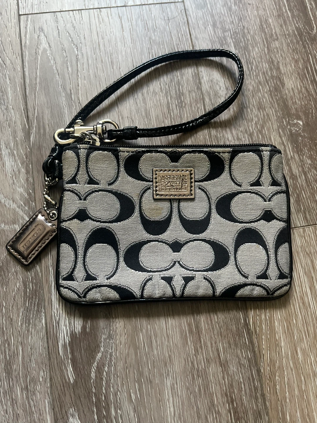 Selling a Coach wristlet. It has a black and white design with a purple interior. Elegant Coach wristlet with signature pattern. Features a sleek black strap. Ideal for versatile styling. Vintage Y2K piece from coach poppy collection Cute little wristlet, In good preloved condition Pickup Brampton or downtown Toronto