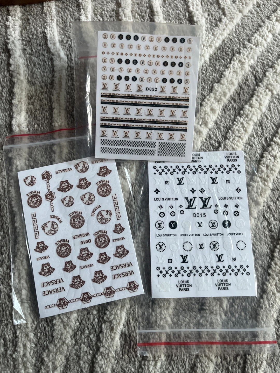 I have some fun nail art stickers featuring Louis Vuitton and Versace designs! Perfect for adding a designer touch to your nails. They're in individual clear bags and ready to use