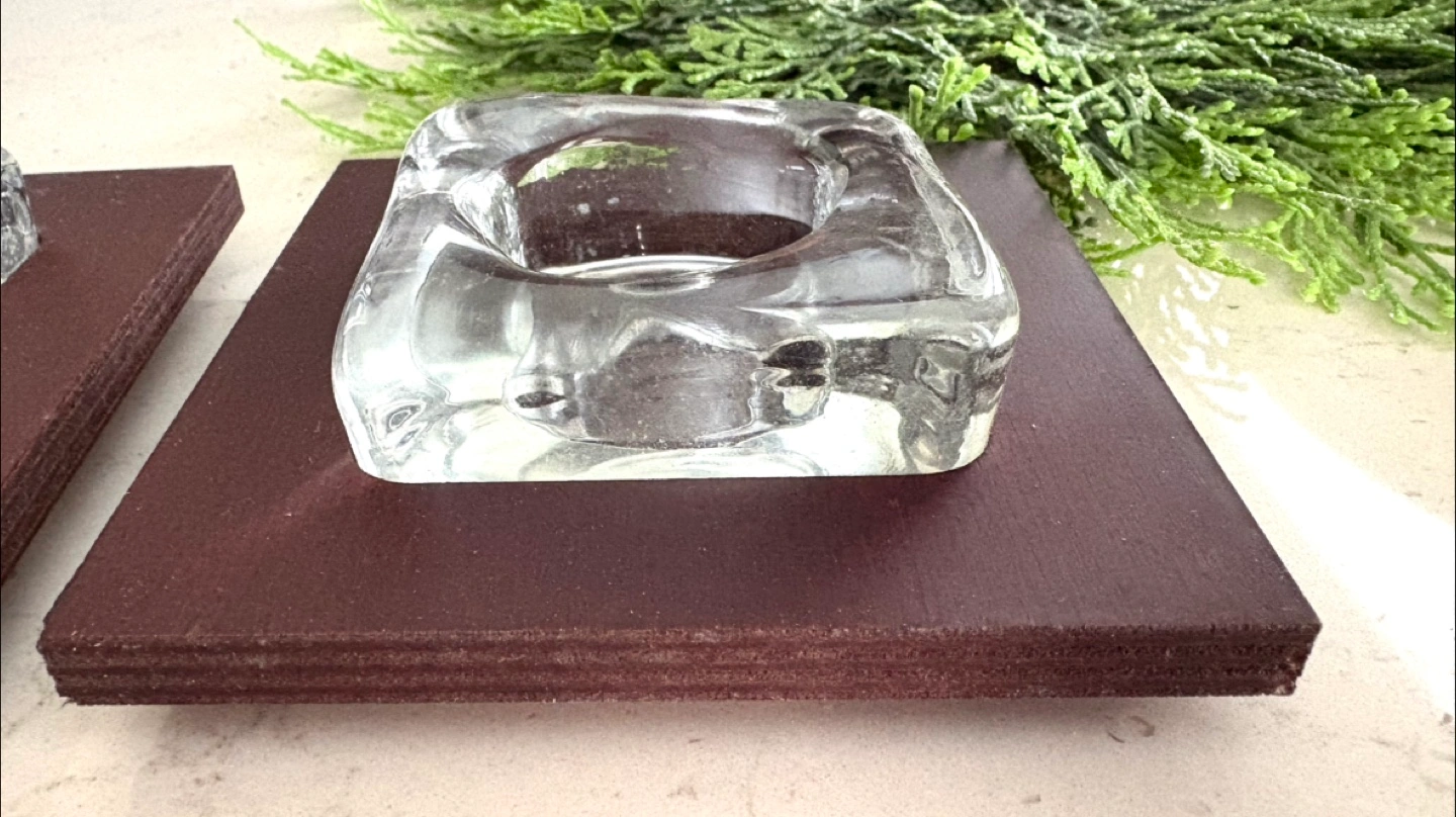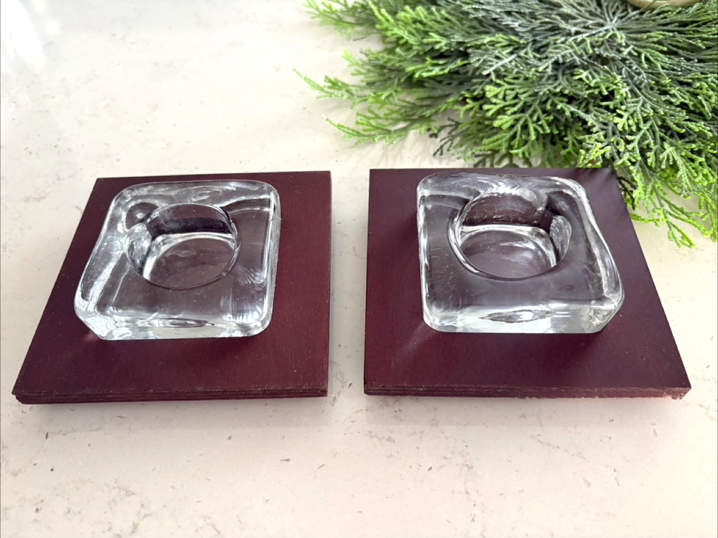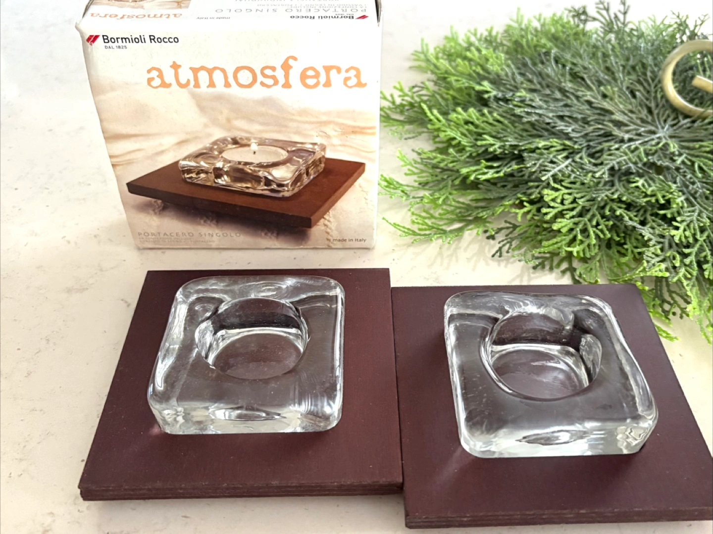 Made in Italy ๐ฎ๐น Here are two Bormioli Rocco Atmosfera glass & wooden candle holders! They each feature a clear glass candle holder sitting on a square brown wooden base. They come with the original box! Nice great ideas. Base 5โ x 5โ Glass 3โ x 3โ
