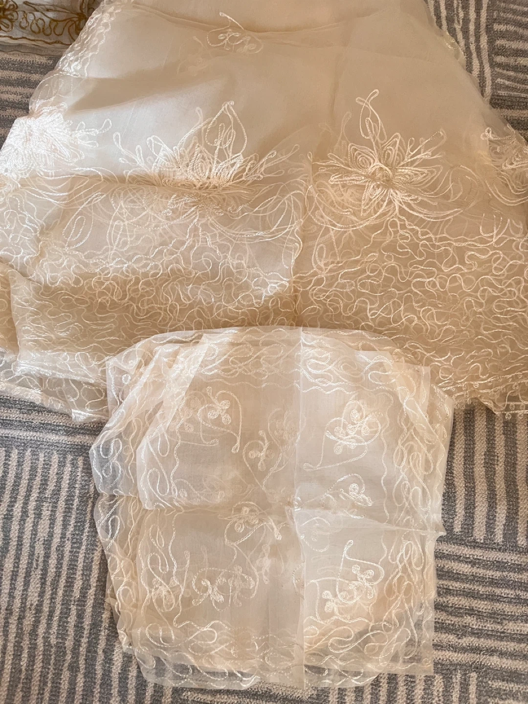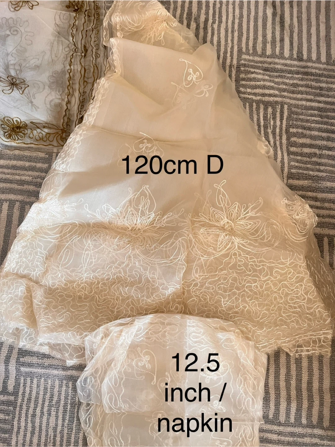 Selling a lovely lace tablecloth with matching napkins! The tablecloth is 120cm in diameter, and the napkins are 12.5 inches square. They're in great shape and would add a touch of elegance to any table