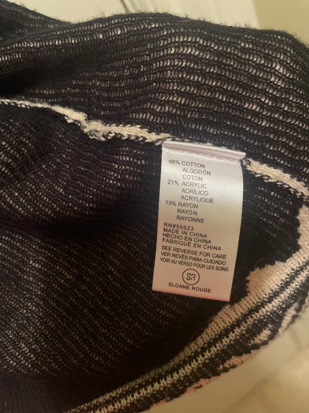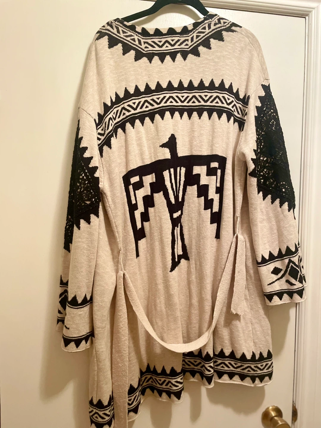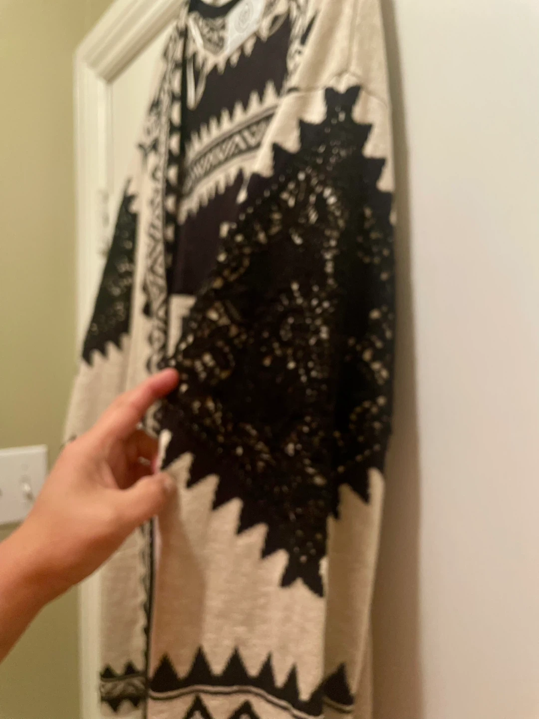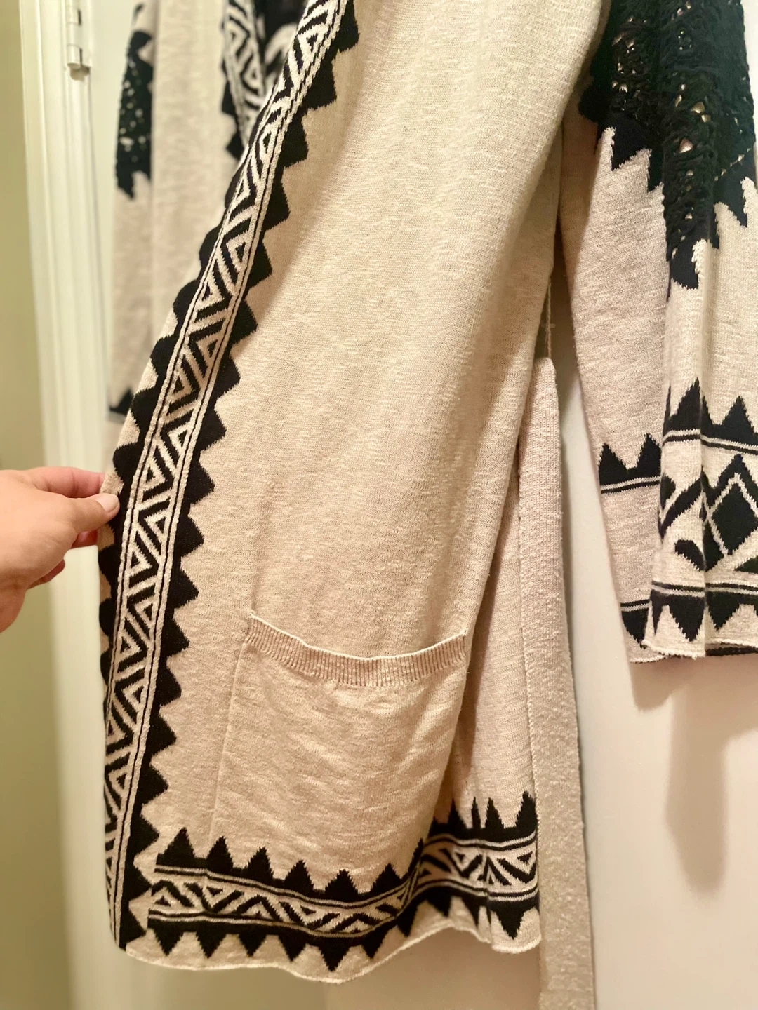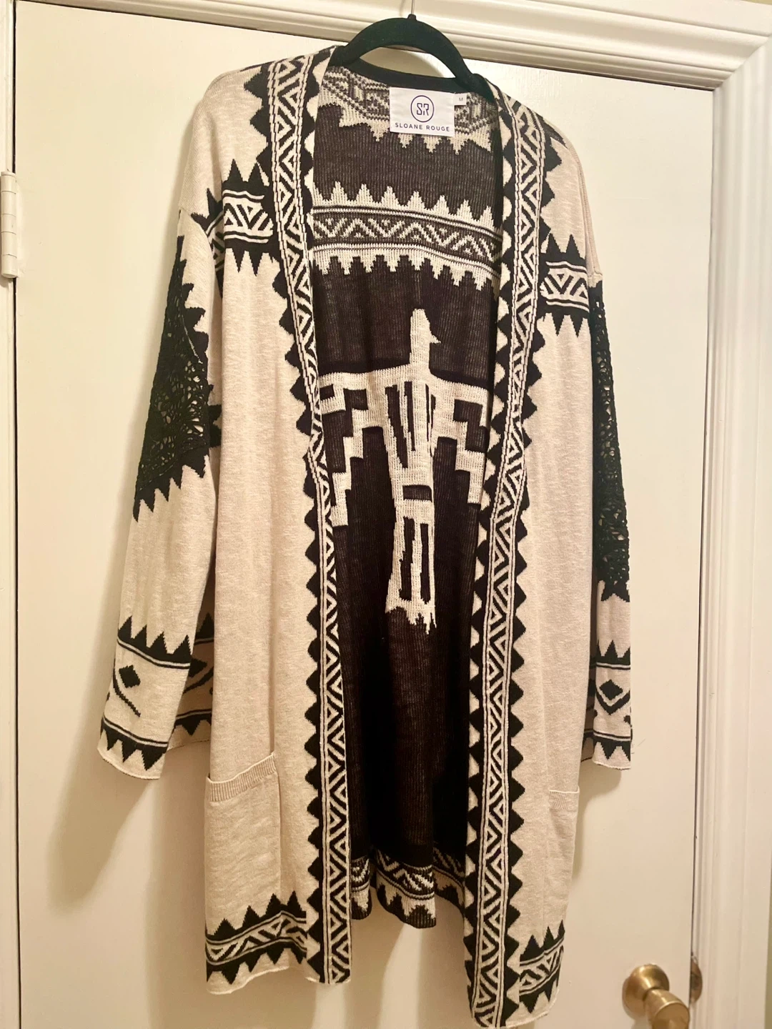 Here's a lovely Sloane Rouge cardigan! It's a size SR and made of 66% cotton, 21% acrylic, and 13% rayon. It features a unique Aztec-inspired design in beige and black