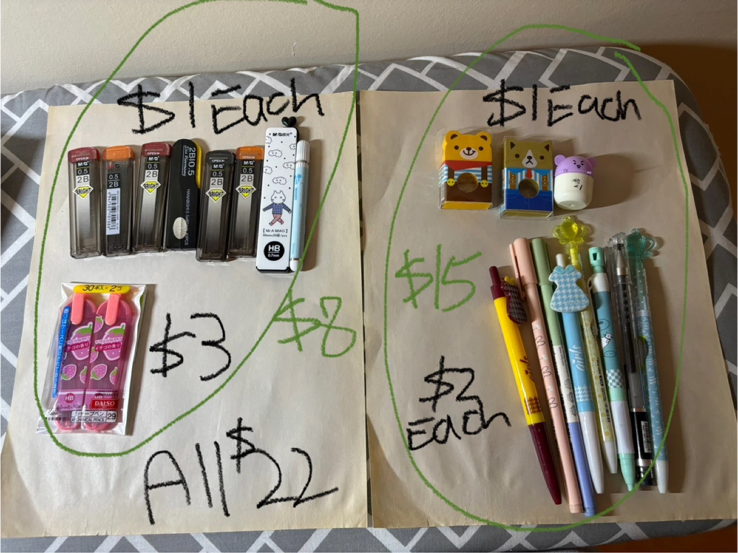 I tried the pens before selling so the one I chose are all working. I'm also selling bundles of unopen mechanical pencils and pencils for kids. Colourful and make study, writting lots of fun! There are lots of 0.5 and 0.7 box of lids. One Christian Bible verse graduate frame. Perfect for graduate students or already graduate and want a frame to put photo. 3 in X3 in One iPhone 6 screen protector only one. Angel can say "I love you" when you press the top! Fun! All cost are in each photos.