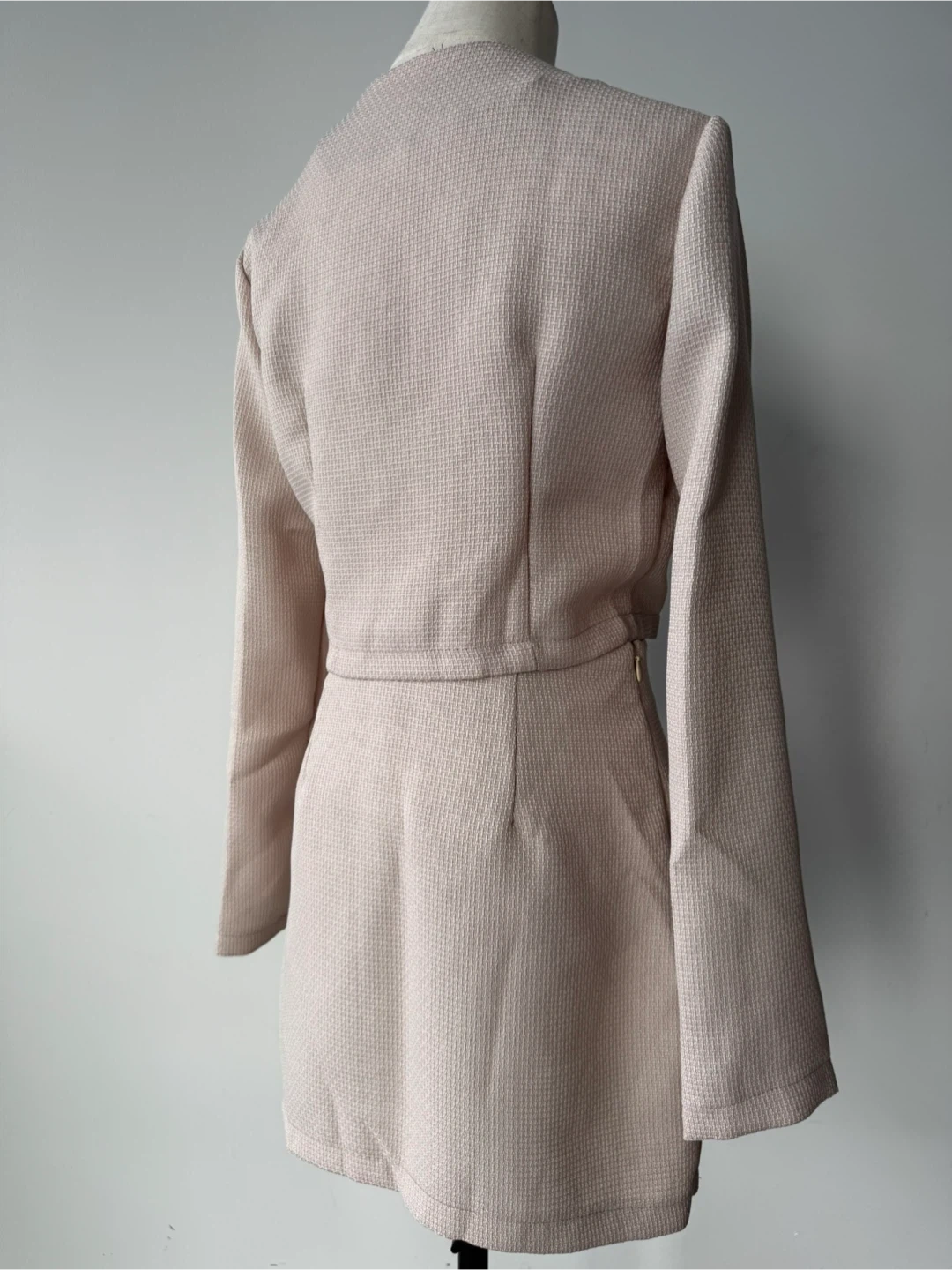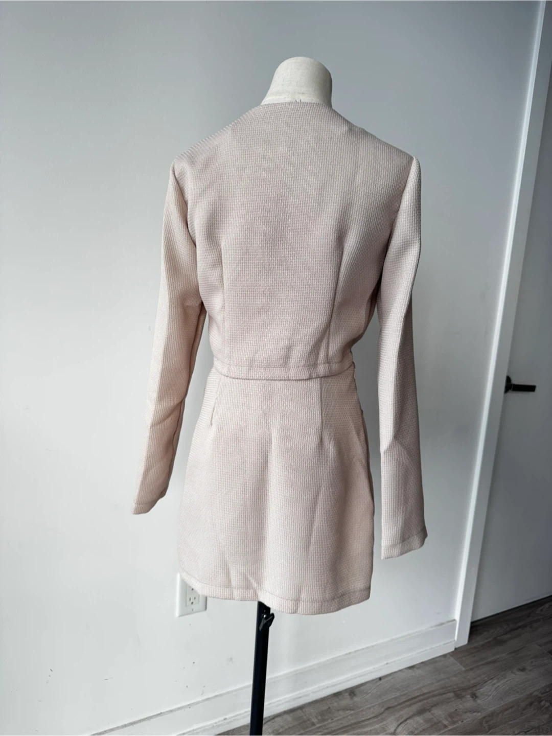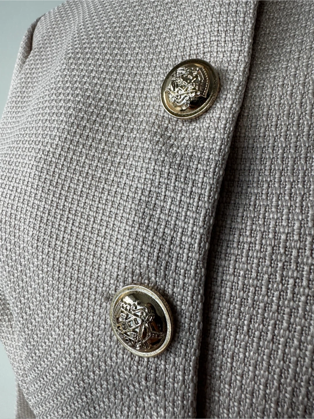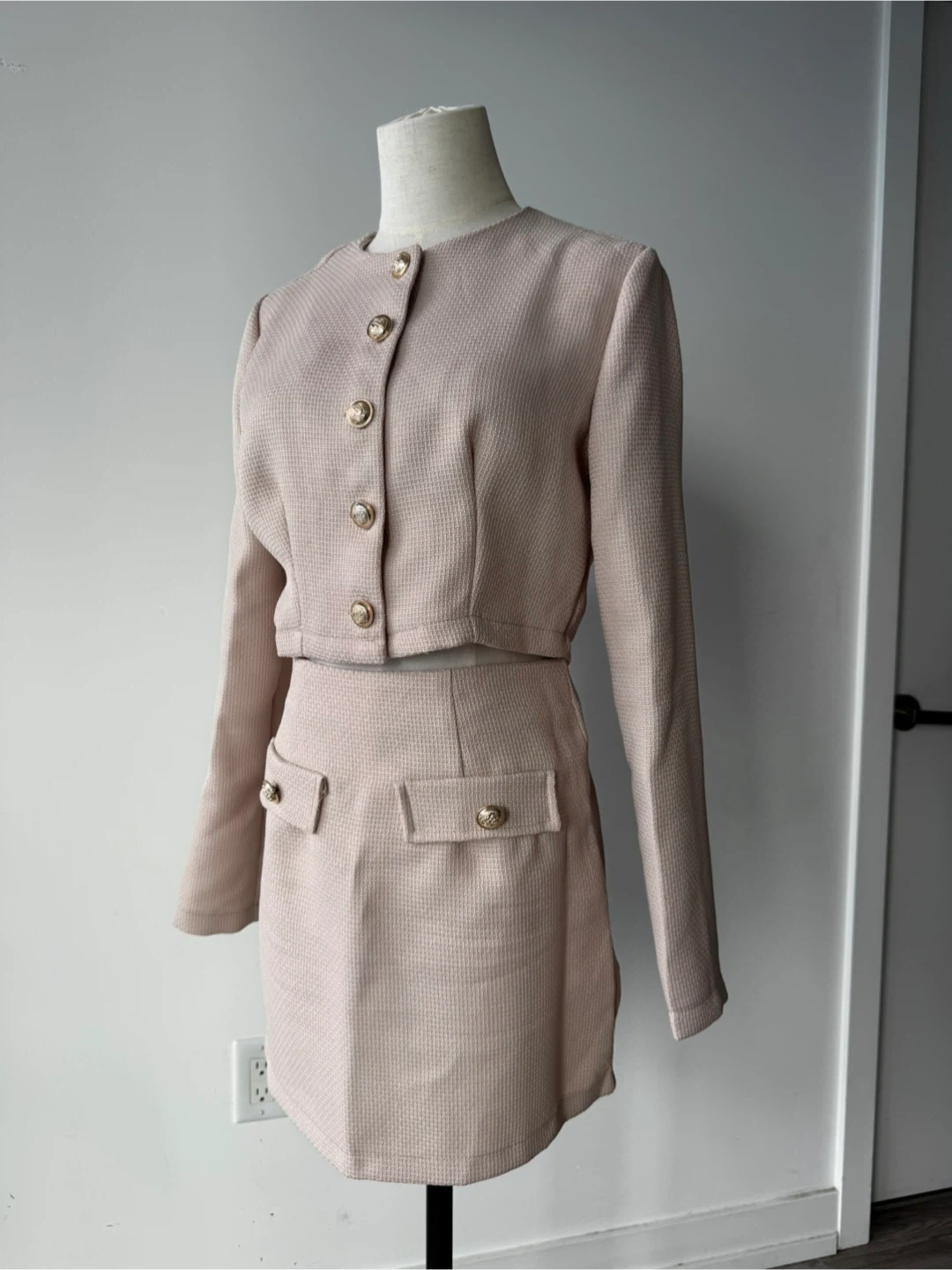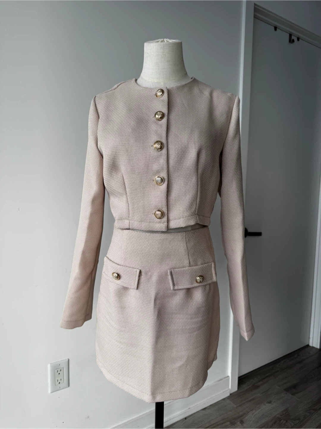 Selling a beige skirt suit set. The set includes a cropped jacket and a matching skirt. The fabric has a subtle textured weave, and the jacket features decorative gold buttons. Great for a polished and put-together look!