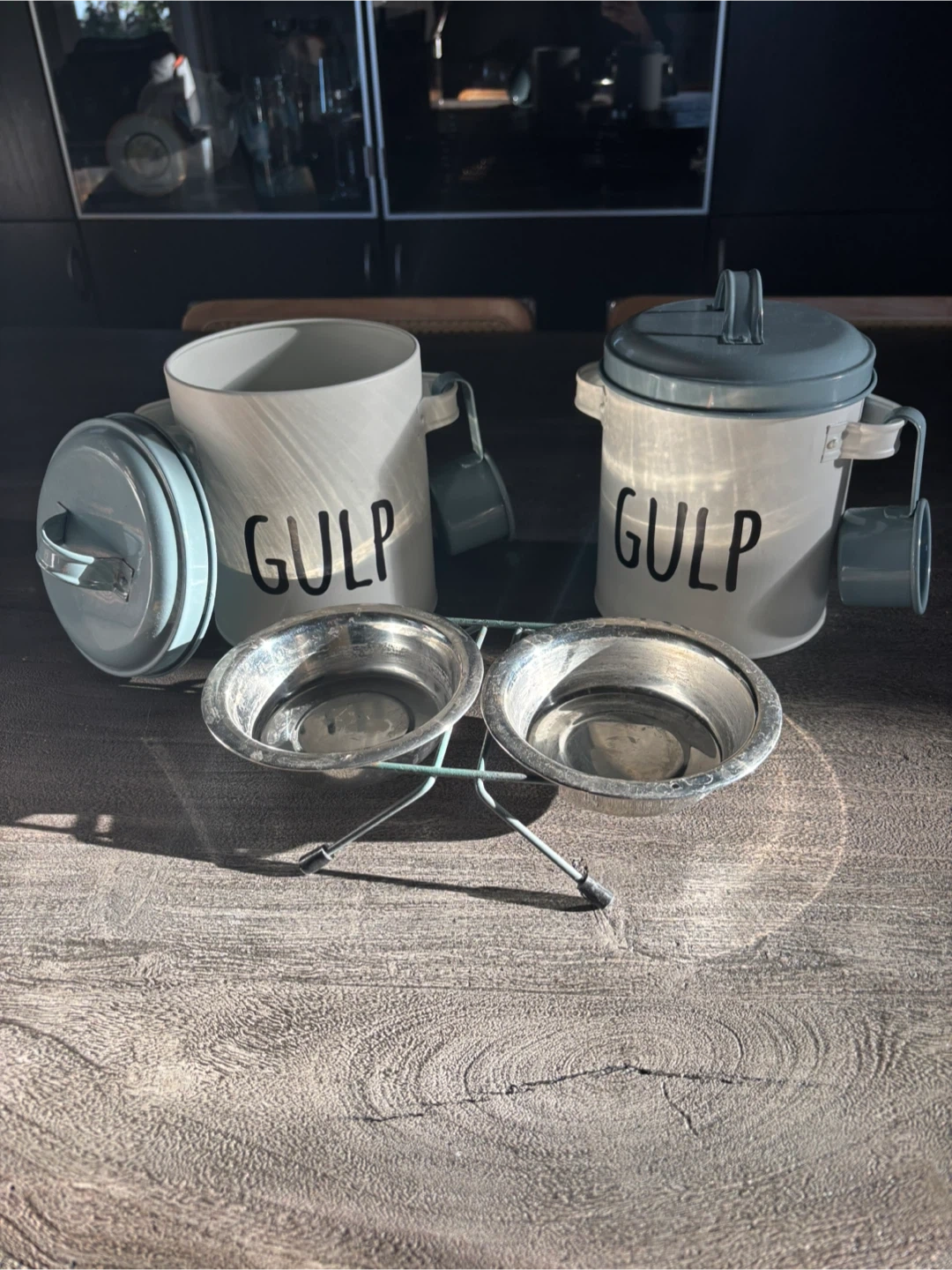Here's a cute a set for pet food and water bowls! It includes two metal bowls in a stand, and two food storage containers with lids and scoops. Perfect for keeping your furry friend fed and hydrated