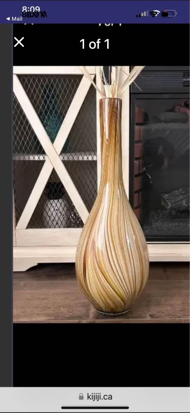 Here's a beautiful decorative glass vase with a brown swirl pattern. It would look great as a centrepiece or accent in any room! It's in excellent condition and ready to find a new home