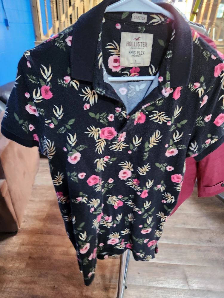 Selling a Hollister Epic Flex polo shirt in size small! It features a cool floral pattern on a black background. It's in great condition and ready for a new home!