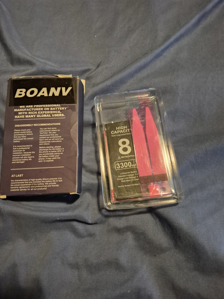 Selling a brand new BOANV high capacity battery for an 8 Plus. It's a new upgraded battery with 3300mA. Never been used and comes with the original packaging!