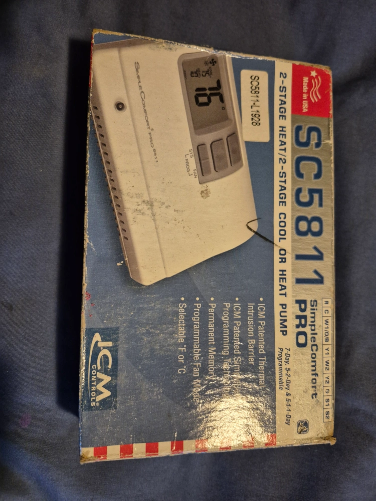 Selling a SimpleComfort SC5811 Pro 2-Stage Heat/2-Stage Cool or Heat Pump thermostat. It features: - 7-Day, 5-2-Day & 5-1-1-Day Programmable settings - ICM Patented Thermal Intrusion Barrier - Programming Technology - Permanent Memory - Programmable Fan Mode - Selectable °F or °C