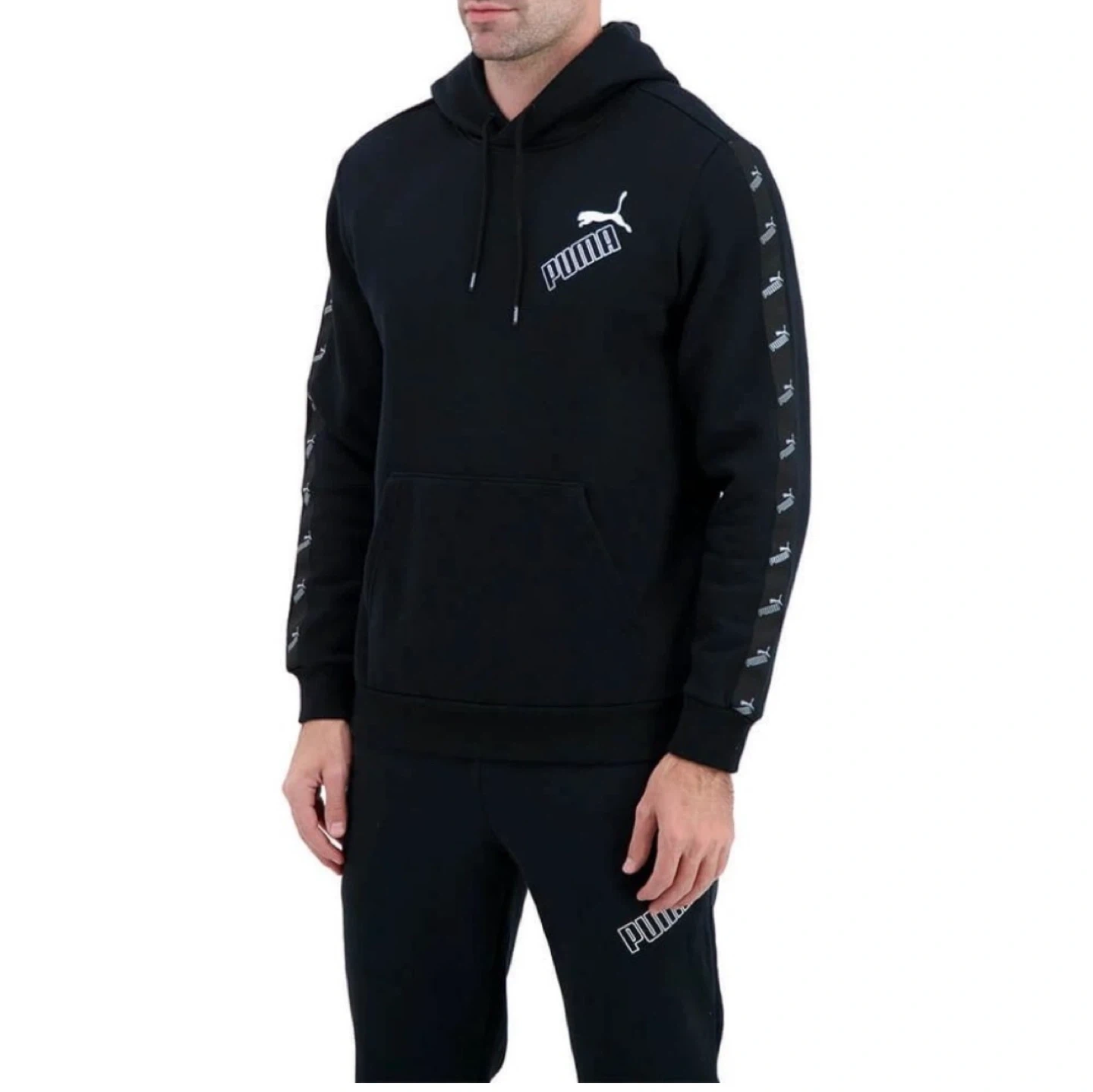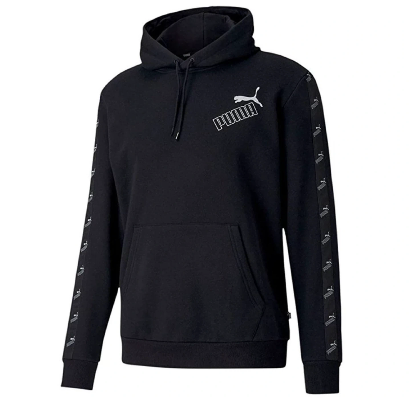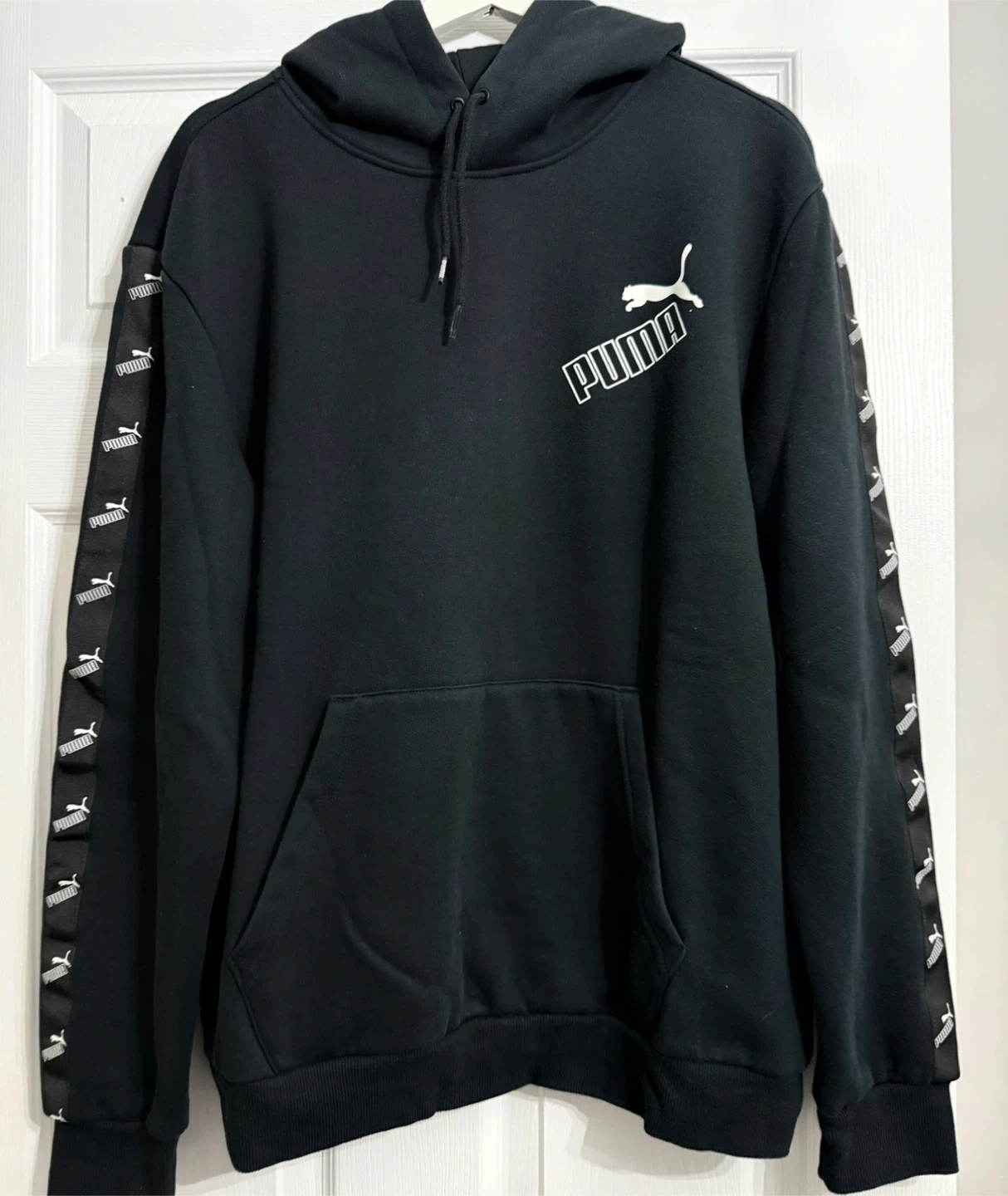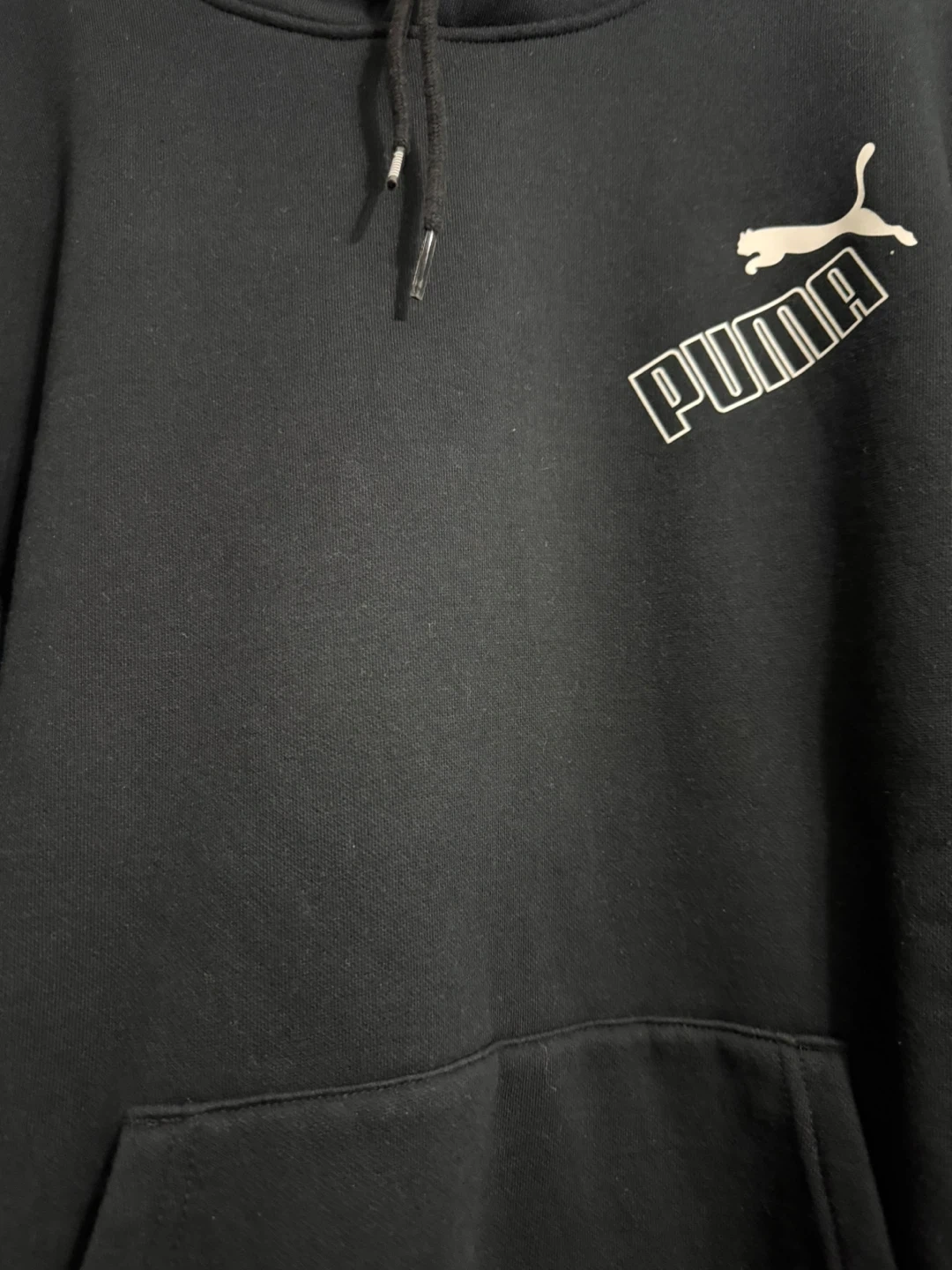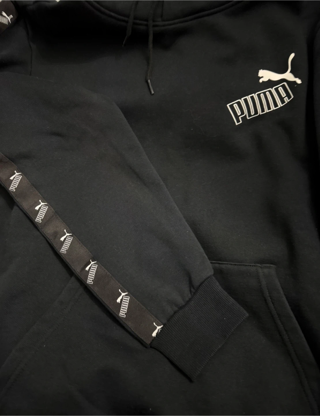 Selling a black Puma hoodie. It features the Puma logo on the chest and a unique design on the sleeves. Great for casual wear! Ptp 26” Length 28”