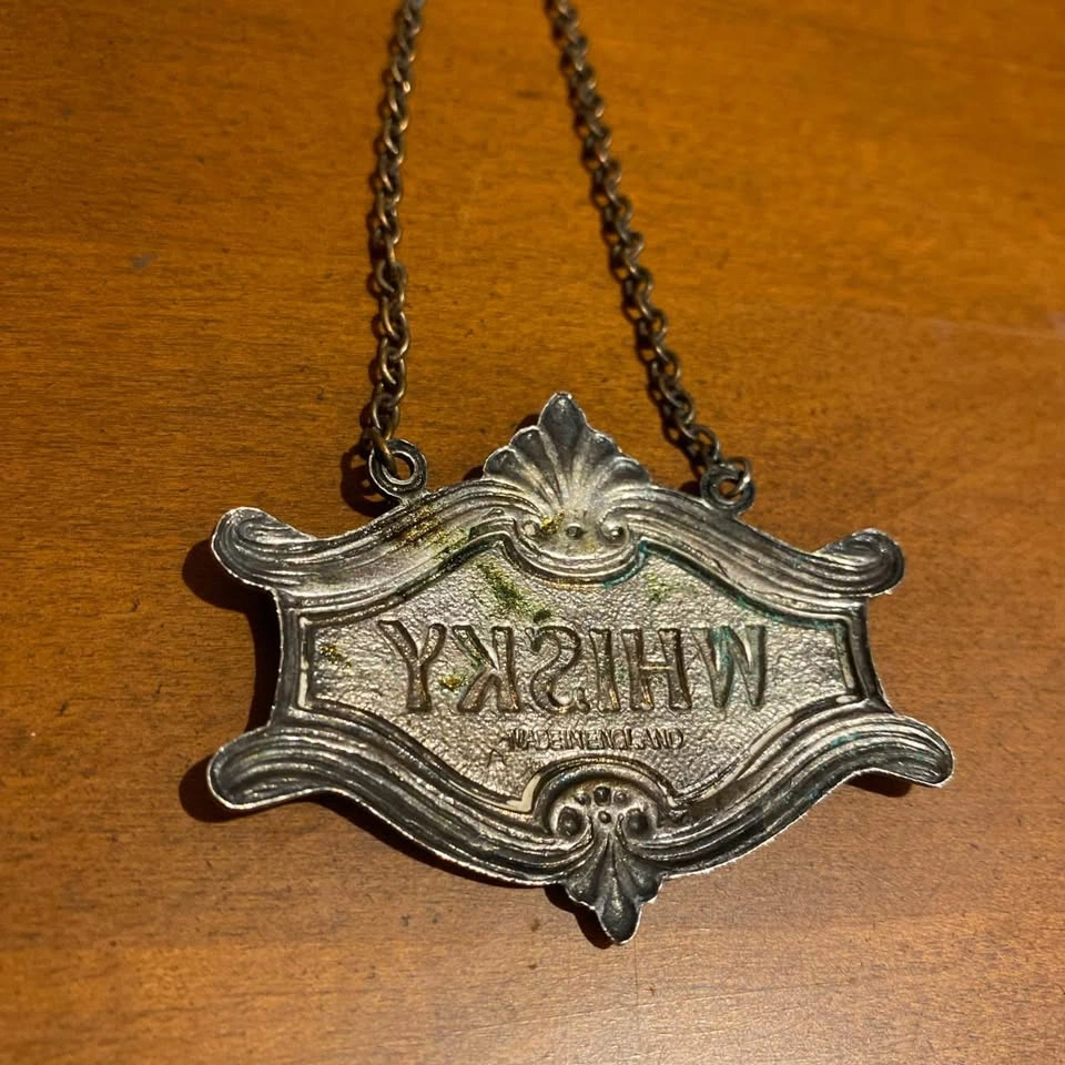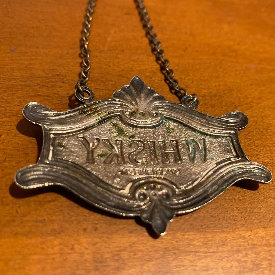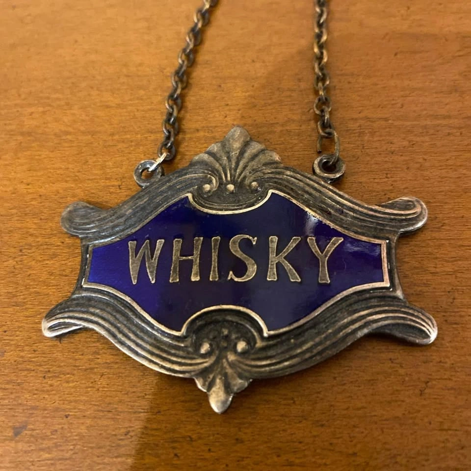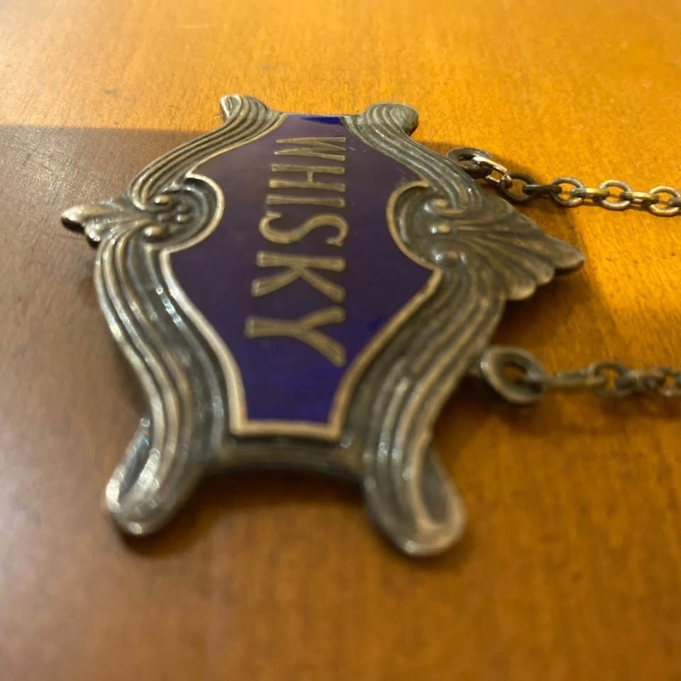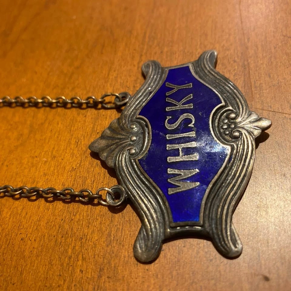 1930s silver plated and Royal Blue Guilloche Enamel Whiskey Decanter Label. Made minor repair to the chain to retattach. Great antique piece for your bar, restaurant, or collection. Pick up in south Barrie. Cash or e-transfer accepted. Offers welcome.