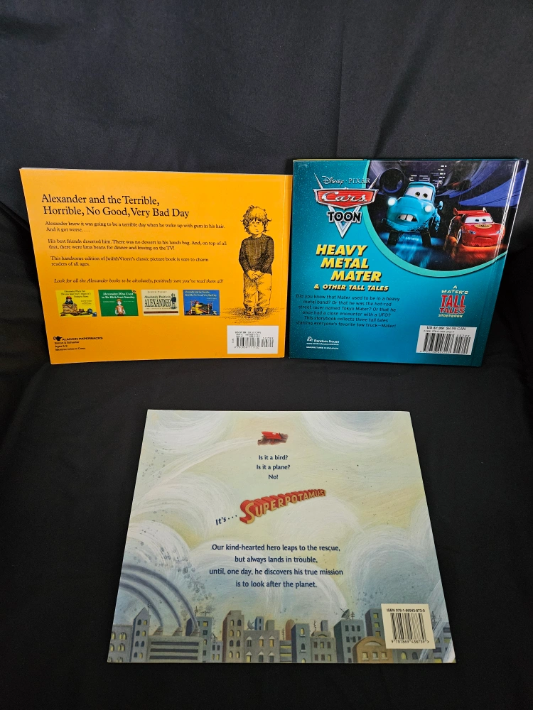 Price includes 2 children's books in like new or excellent condition. Titles Include: - "Alexander and the Terrible, Horrible, No Good, Very Bad Day" by Judith Viorst - Disney Pixar "Cars Toon: Heavy Metal Mater & Other Tall Tales" - "Superpotamus" by Ruth Paul Milton pick up, cash only, no holds.