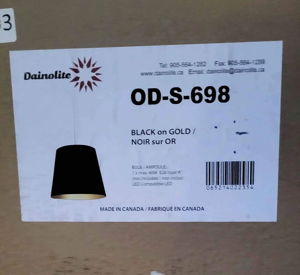 Brand New pendant light. It comes unassembled in original box with all manufacturer parts and hardware for easy assembly. * Bulb not included. ** Two lights available. Price per light. Retails at Home Depot for $370 ($327 + tax). Save your money. P Pickup from south London. Dainolite Oversized Drum LED 14 inch Black Pendant Ceiling Light in Black/Gold Jewel Tone, Made in Canada Product details: Brand: Dainolite Model #: OD-S-698 Application (UL Listed): Dry Location Bulb Base: Medium (E26) Bulb Type: Led Bulb(s) Included: No Certification: Cul/Ul/Csa Cord Length: 48" Country of Origin: Canada Depth: 14" Finish: Black Height: 14" Length: 14" Light Direction: Ambient Lighting Materials: Fabric Max Wattage: 60w Mount Type: Cord Mounted Number of Bulbs: 1 Pendant Size: Medium (10"-22") Pendant Type: Single Pendant Projection: 14" Secondary Color(s): Black Series / Collection: Oversized Drum Special Features: Adjustable, Dimmable, Sloped Ceiling Compatible Style: Contemporary / Modern Voltage: 120v Wattage: 60W Weight: 2 lbs Canopy/Back Plate/Base Height: 1" Canopy/Back Plate/Base Diameter: 4.5" Canopy/Back Plate/Base Color: Matte Black Type of Drop: Cord Drop Maximum Length: 48" Drop Minimum Length: 3" Number of Shades: 1 Shade Height: 14" Shade Top Diameter: 11" Shade Bottom Diameter: 14" Shade Fitter: Split Washer