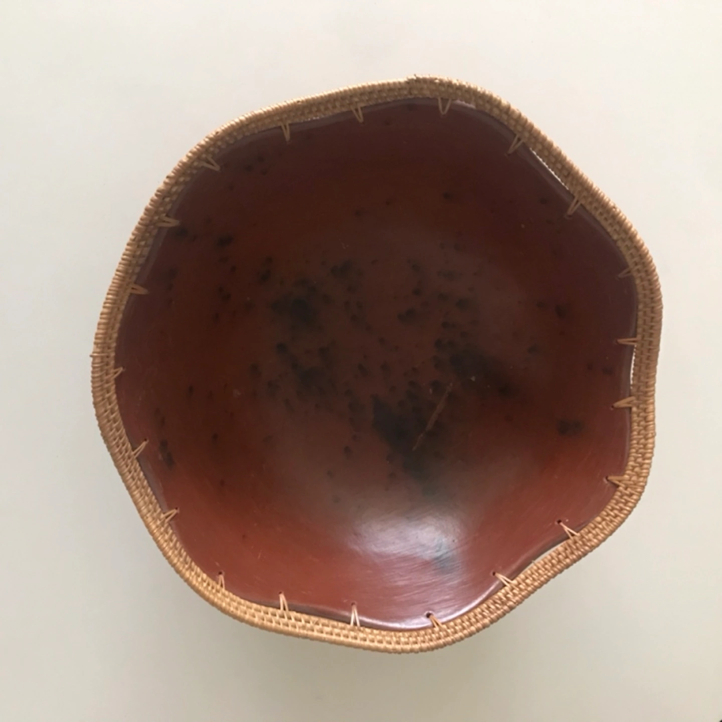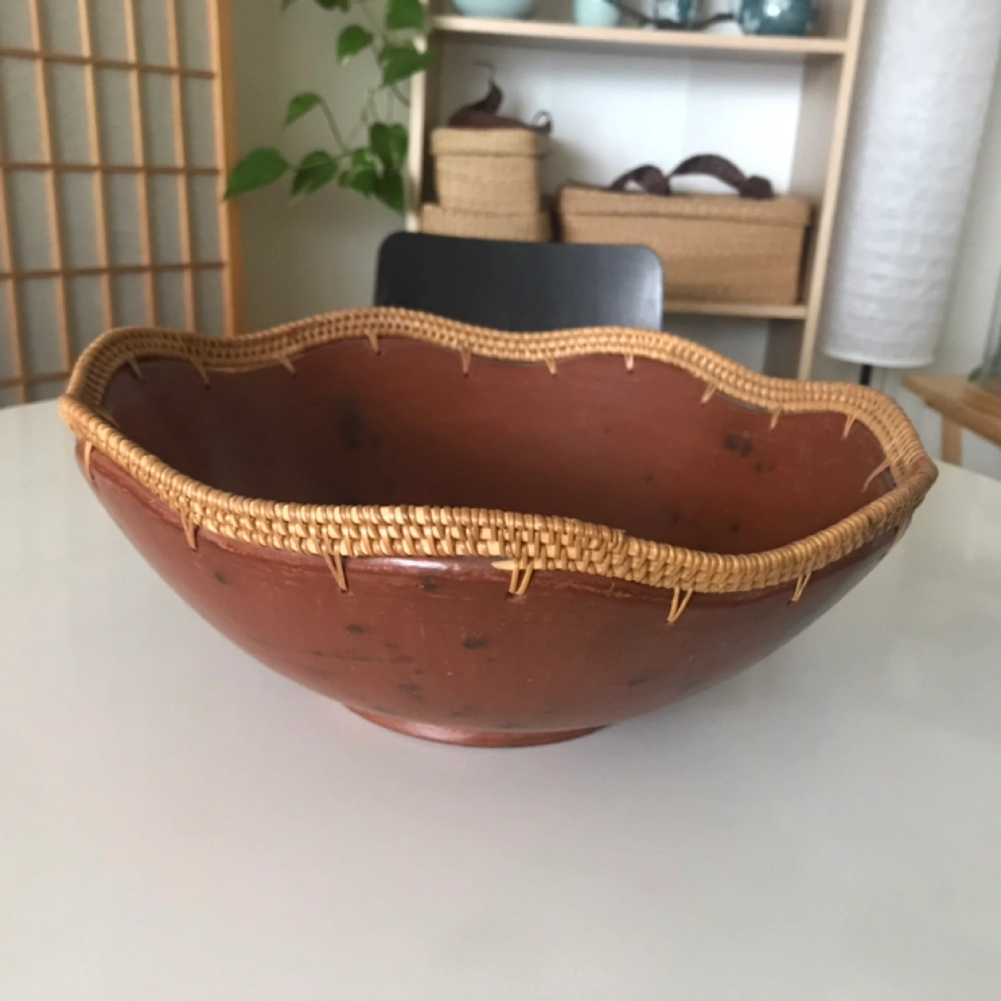 Bring an international design flair to your home with a very unique, decorative bowl from Africa (bought during travels). Made with all-natural earthy materials, a ceramic in homage to the rich red earth found in many East African countries. Wavy, scalloped curves are laced with tightly-woven savannah grass. The bowl is very smooth to the touch and and has a good solid weight to it. 12” W x 4 1/2” H ✨A very unique statement piece!