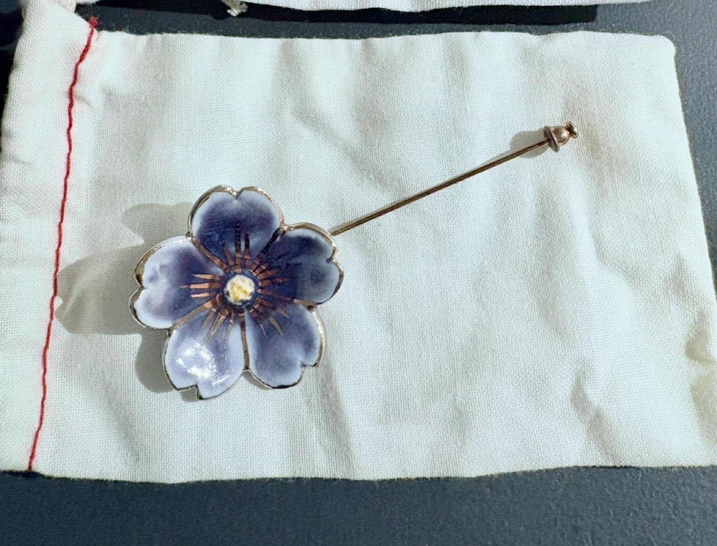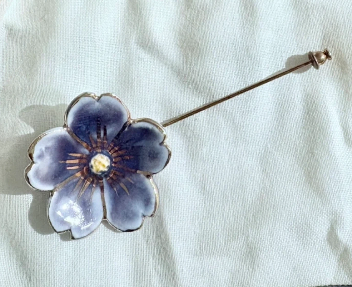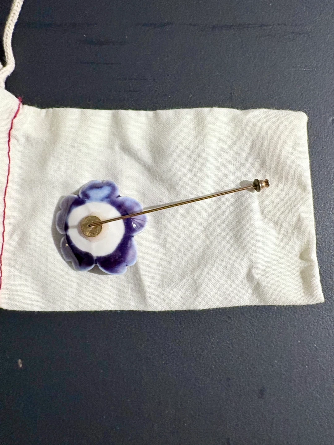 Julie Moon Flower Pin Julie Moon Ceramics Flowers of Canada Collection New Brunswick Purple Violet Pin Local designer Hand-formed porcelain 22 karat gold lustre detail 1 “ diameter Gold stick pin NEW