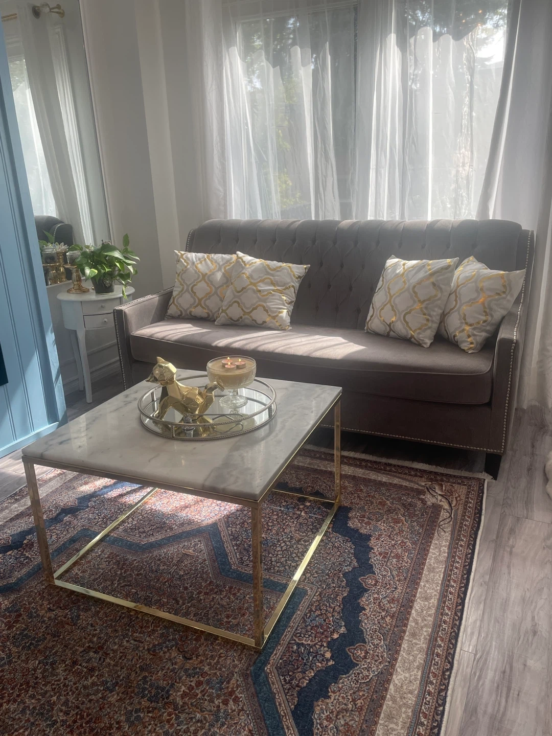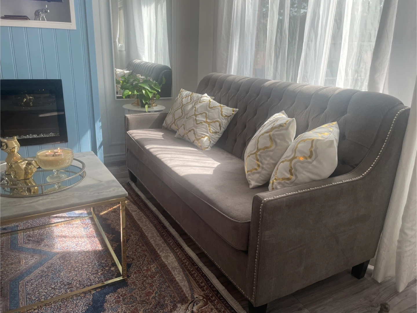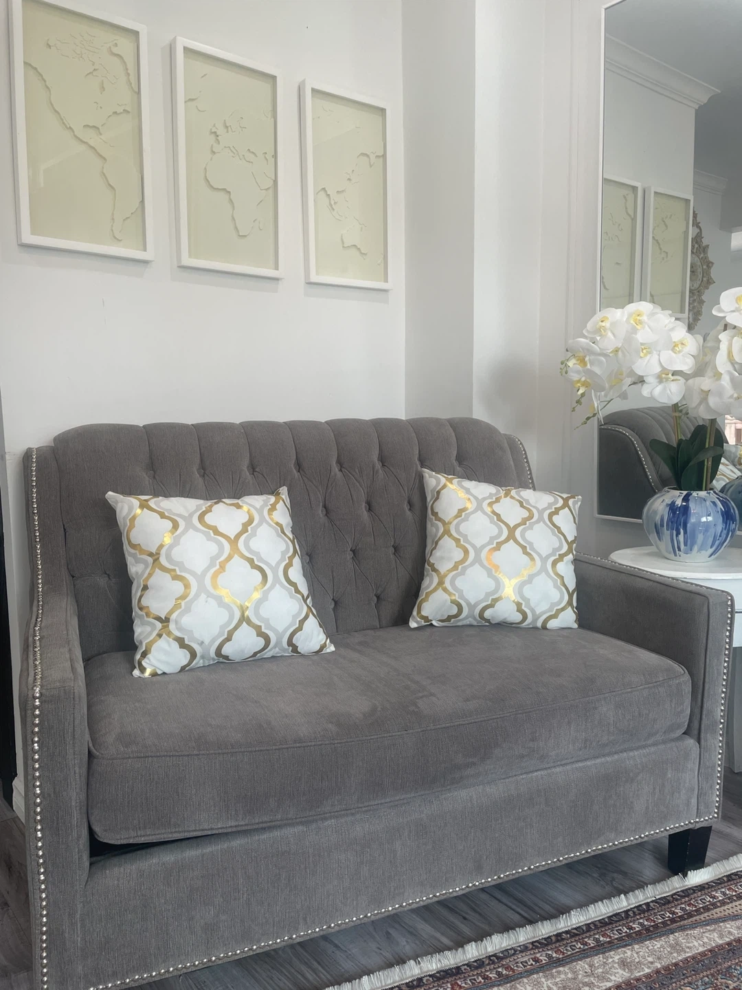 A lovely grey tufted loveseat in great condition! This includes 2 x love seats sold as a set and 1 sofa dimensions are as follows 36H x 51L x 33D 36H x 51L x 33D 36H x 73L x 33D Perfect for a small space or as an accent piece in a larger room. The neutral colour makes it easy to match with any decor