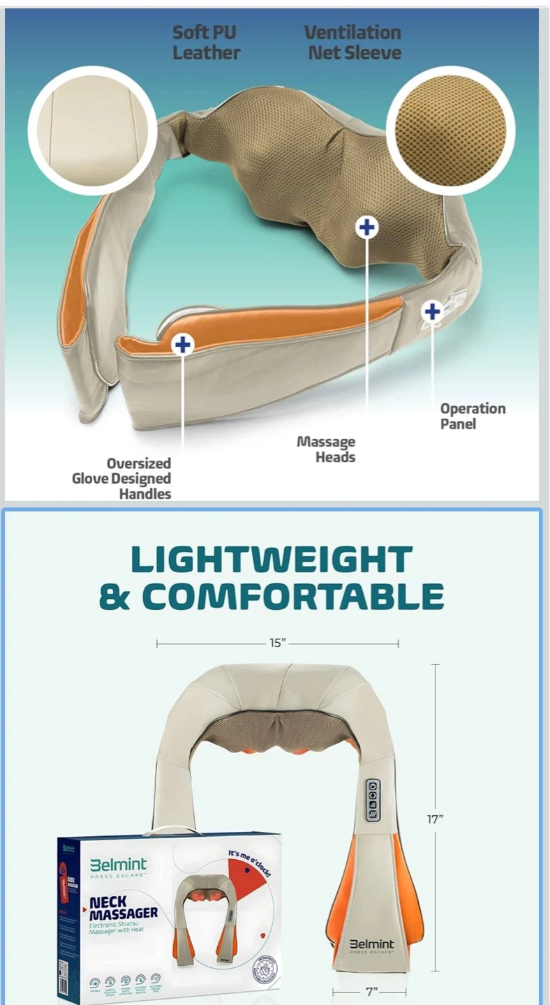 OG PRICE 60$ NEED GONE ASAP Get ready to relax with this Belmint neck massager! It features soft PU leather and a ventilation net sleeve for comfort. The oversized glove design handles make it easy to use, and it even has massage heads with heat! It's lightweight and comfortable, perfect for unwinding after a long day