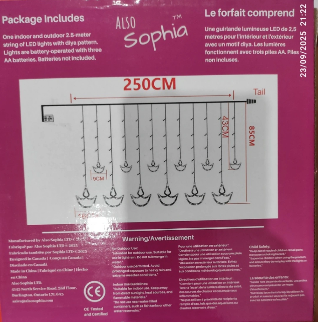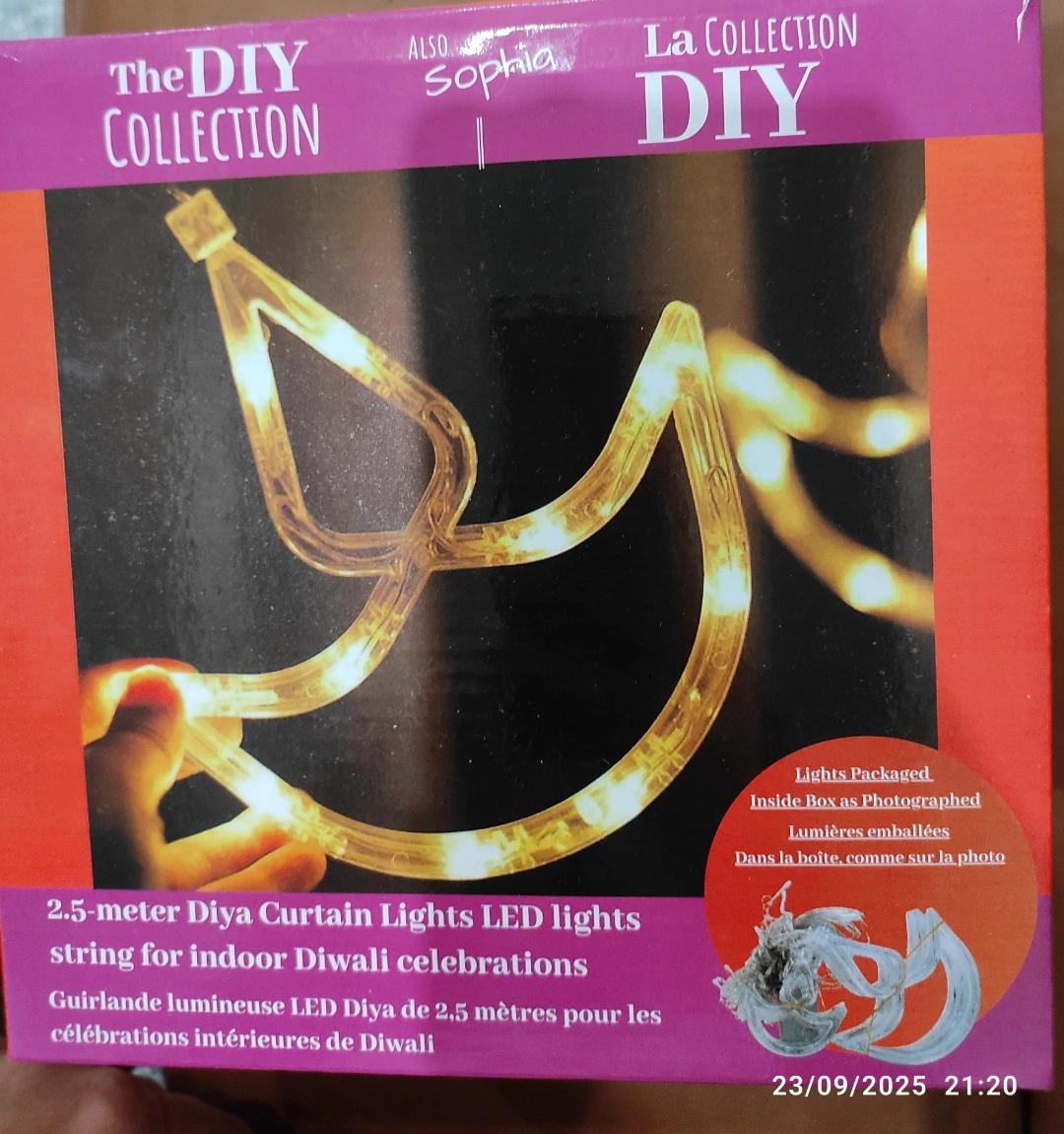 Selling a brand new TheDIYCollection Diya Curtain Lights! It's a 2.5-meter string of LED lights with a diya pattern, perfect for indoor Diwali celebrations. The package includes one indoor and outdoor 2.5-meter string of LED lights with a diya pattern. Lights are battery-operated with three AA batteries (batteries not included). The box is included!