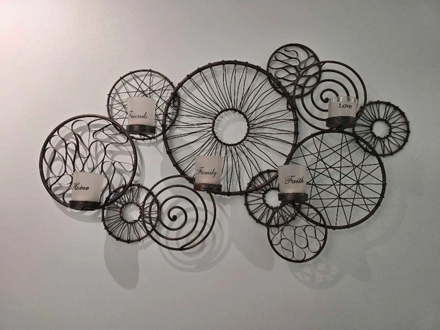 Add a touch of warmth to your home with this lovely metal wall-mounted candle holder, designed to hold five votive candles and decorated with frosted glass votives labelled 'Home', 'Friends', 'Family', 'Faith' and 'Love'. This decorative piece is perfect for creating a cozy atmosphere in any room. Please note this item is used, showing some signs of wear but is still in good condition. Additional Specifications: * Material: Metal, Glass * Style: Wall-mounted candle holder * Capacity: Holds 5 votive candles * Decor: Frosted glass votives with words If the ad's still up, then yes, it's available!