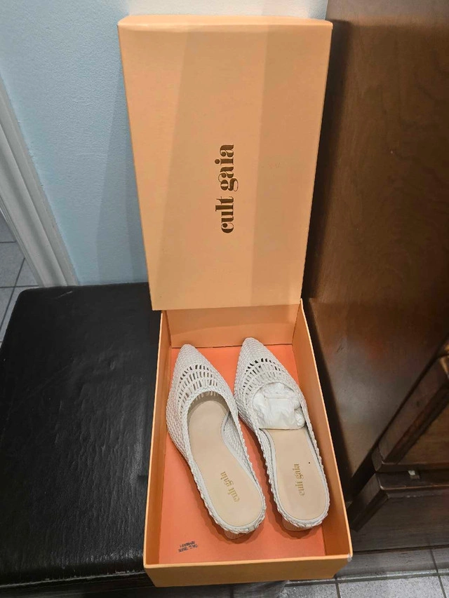Elevate your style with these Cult Gaia White Woven Heels in a women's size 40, perfect for adding a touch of sophistication to any outfit! These stylish heels feature a unique woven design and are in good, used condition, ready to step out in style. Specifications: * Brand: Cult Gaia * Colour: White * Style: Woven Heels * Size: Women's 40 If the ad is up, they're still available—grab them before they're gone!