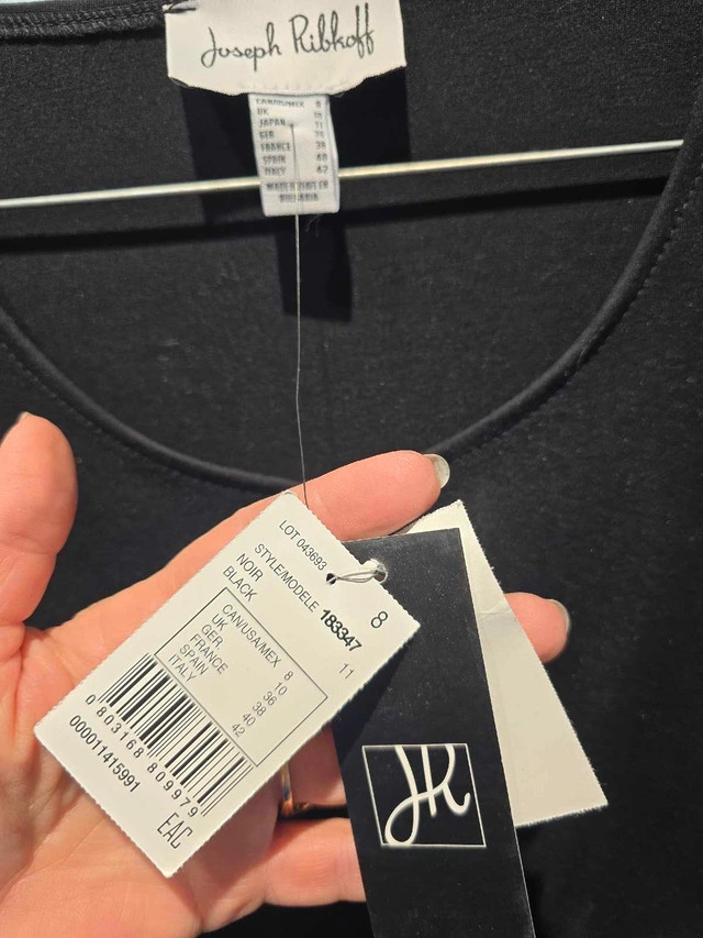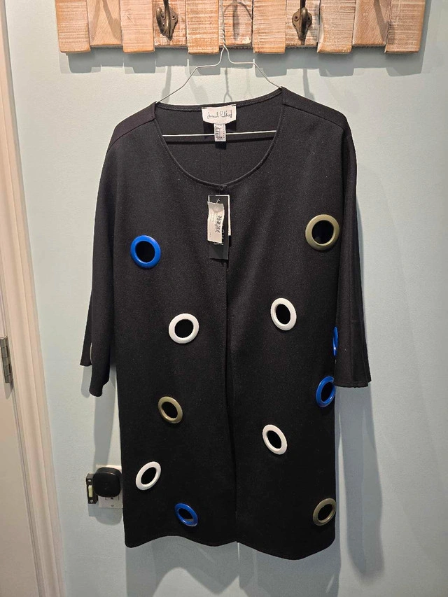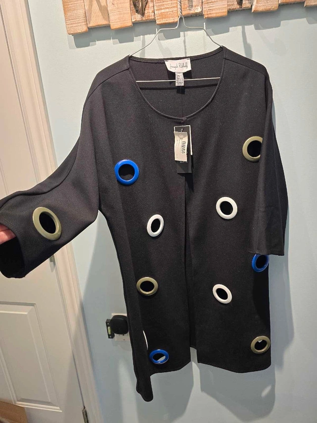 This is a brand new Joseph Ribkoff black jacket or cardigan featuring stylish coloured rings and a comfortable fit. The jacket is size medium, perfect for those who wear sizes 8-10. Key Features: * Brand: Joseph Ribkoff * Colour: Black * Size: Medium (8-10) * Design: Unique coloured ring accents * Condition: New with tags I'm offering it at a great price!