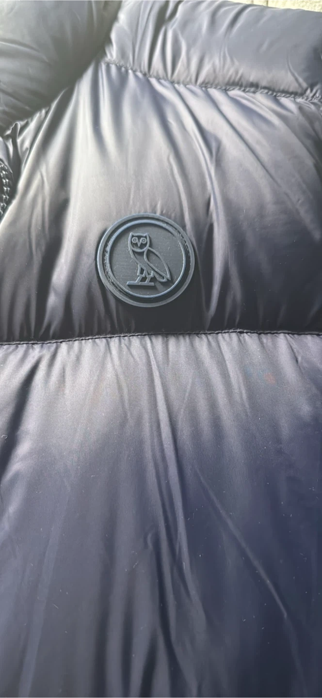 Selling an October's Very Own (OVO) puffer vest in size XS. It's in great condition and perfect for layering! The vest is a stylish navy blue colour with the OVO owl logo. It's a great piece for adding some warmth and style to your outfit.