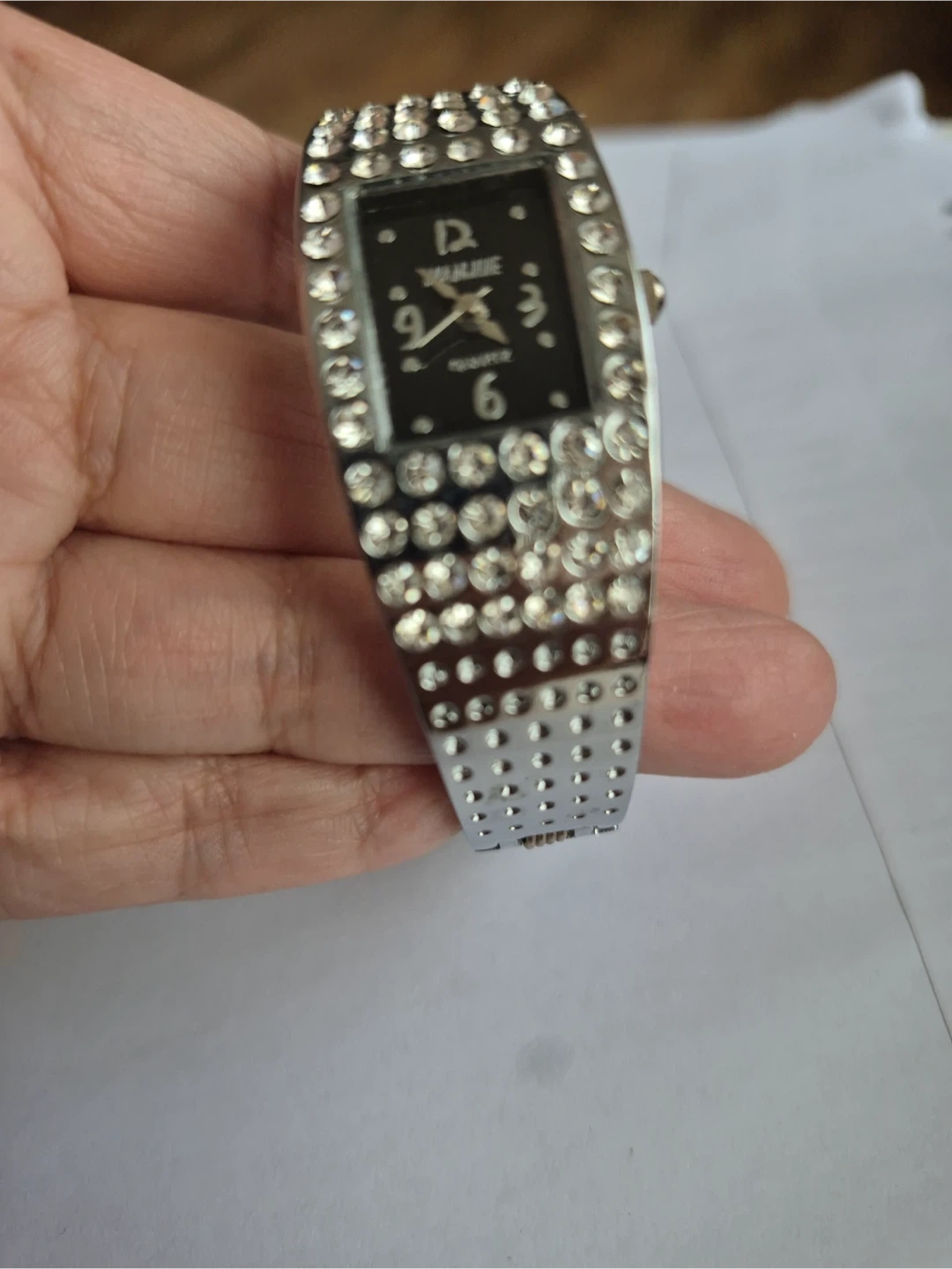Selling a YULIJE quartz bangle watch. It has a black face with rhinestone accents. The watch is in good condition and ready for a new home