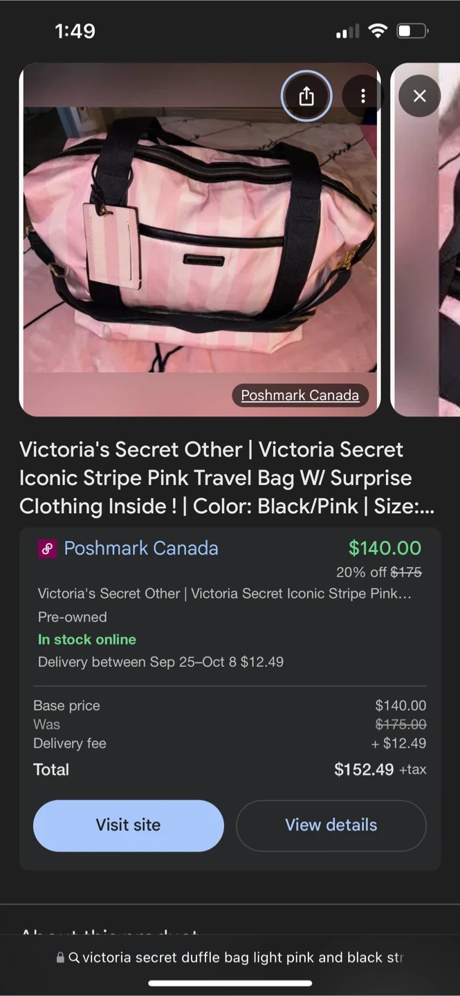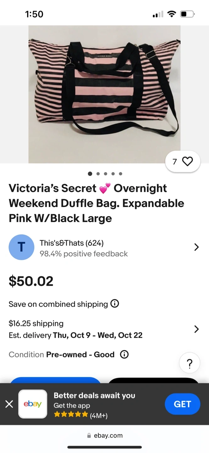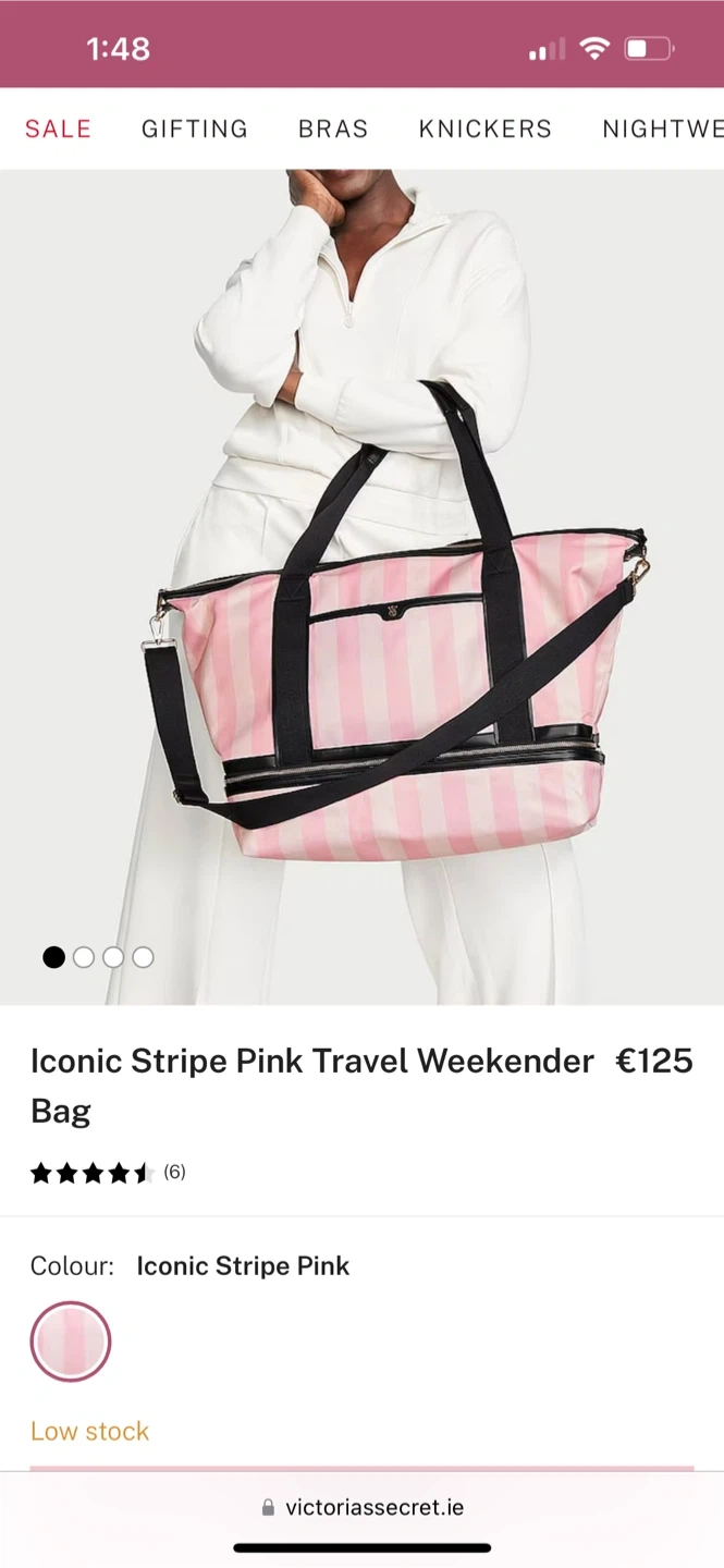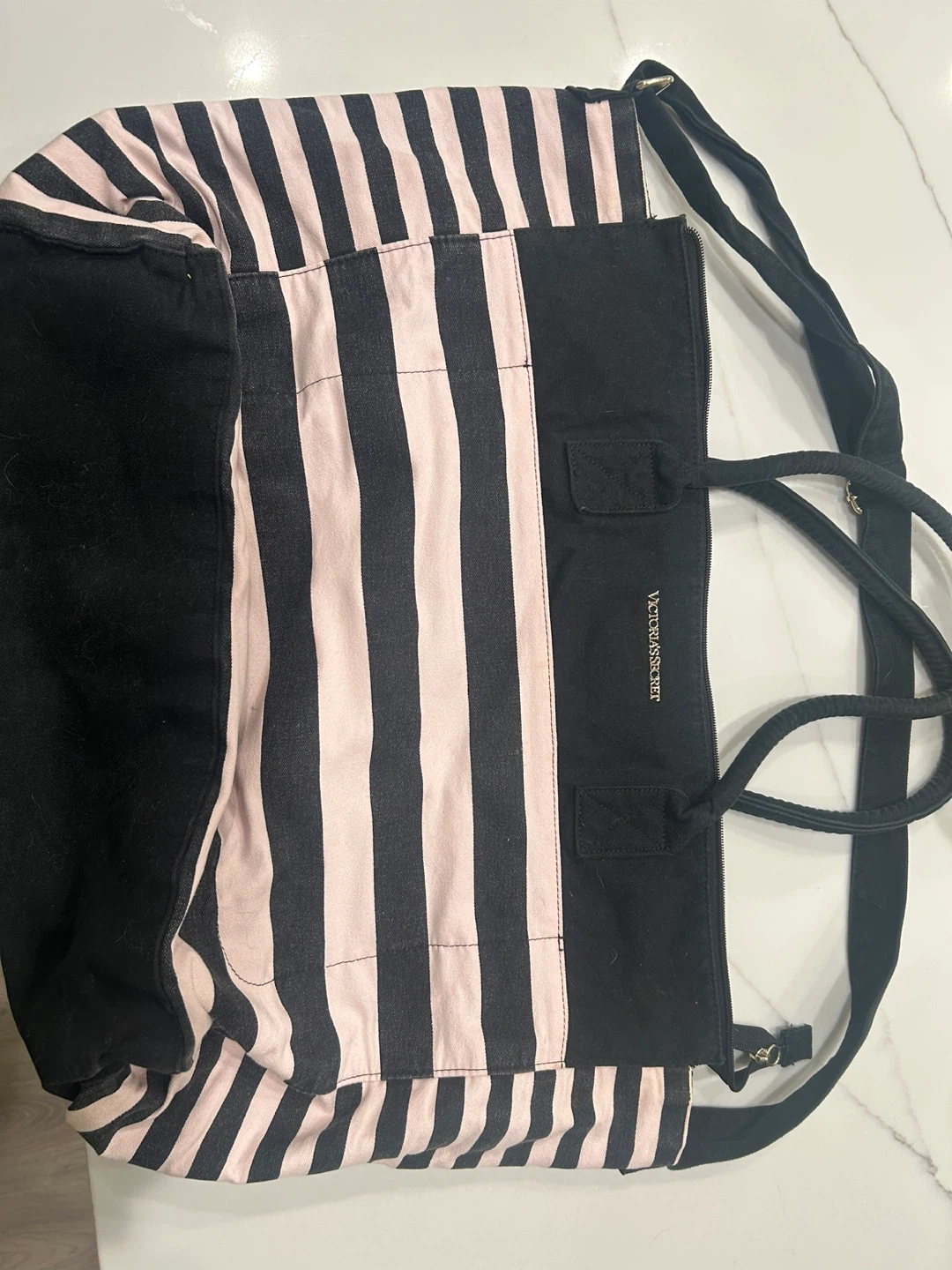 Selling a xxl Victoria's Secret weekender bag in a cute pink and black stripe pattern! It's in good condition and perfect for overnight trips or weekend getaways. This duffle bag is expandable and super stylish! This Victoria's Secret Weekender Duffle Bag is perfect for travel or formal occasions. The bag is made of cotton with pink and black stripes for a stylish look. The bag has double handles with a 7" handle drop and a detachable strap that can be adjusted for convenience. The bag features a zip closure, lined interior with inner pockets, and silver hardware. It is an expandable bag that measures approximately 24"-26" in width, 15 1/2" in height, and 7 1/4" in depth. This bag is ideal for women as it is spacious and has a capacity large enough to fit all the necessary items for any trip.