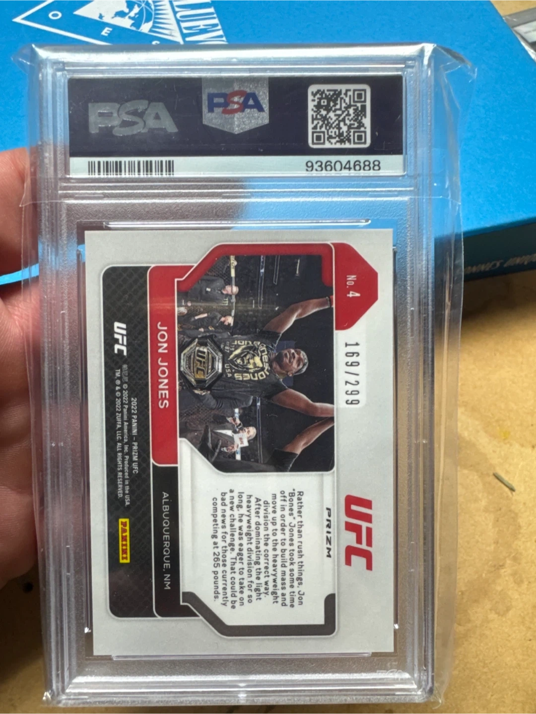 Selling a 2022 Prizm UFC Jon Jones Red Prizm trading card. This card is number 4 and is graded Mint 9 by PSA. Great for any UFC or Jon Jones fan!