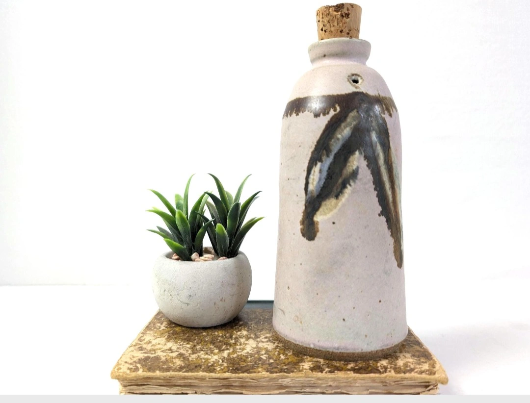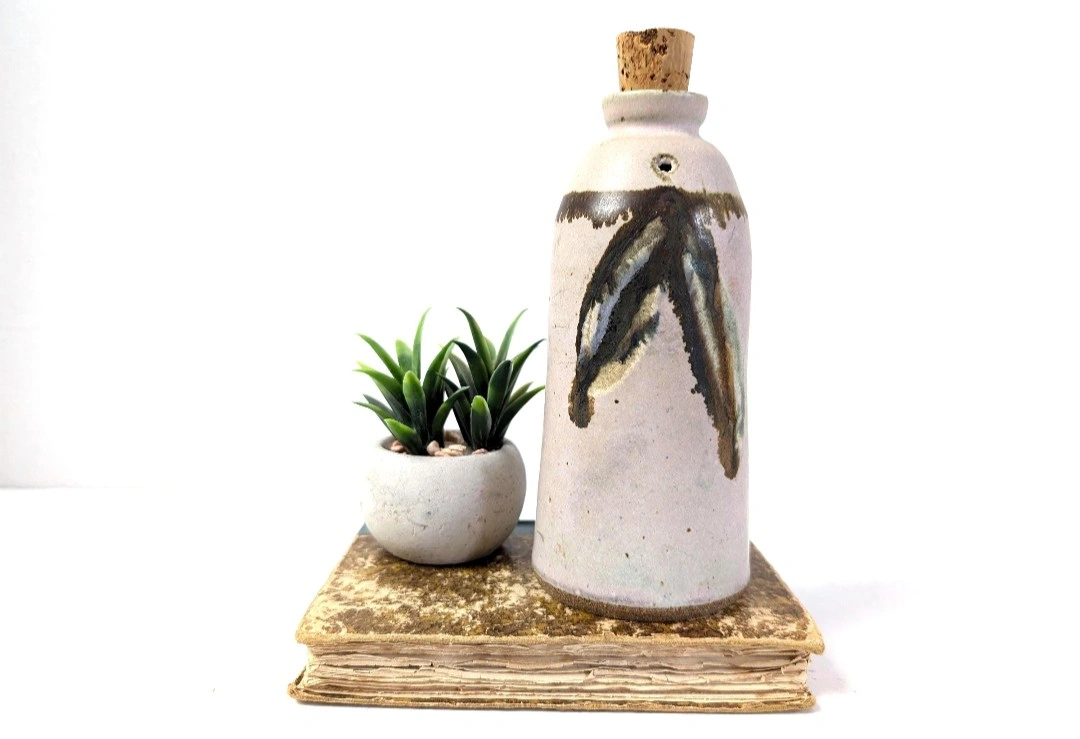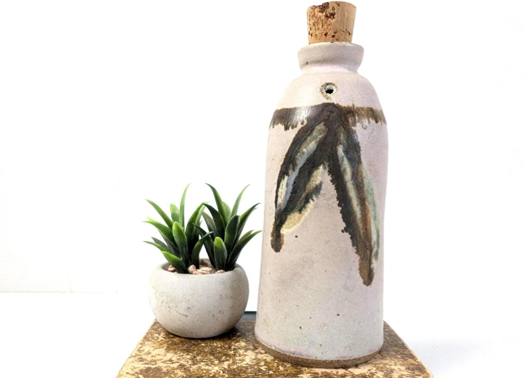 Pottery made cruet bottle. Glazed in neutral tones to suit any decor. Measures approximately 7 inches in height. It's Corked and has a small puncture hole on the neck of the bottle. I suspect this may be part of cooking process, however full disclosure, I'm really not sure. That being said, this little darling needs a new home. Good vintage condition. Excellent retro bohemian vibe. π PICK UP TOWNLINE HWY 2 AREA π CASH is preferred please π Thanks for looking π©΅