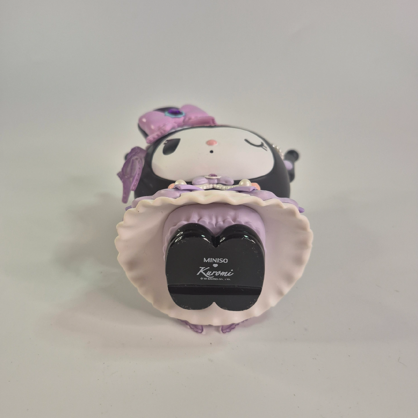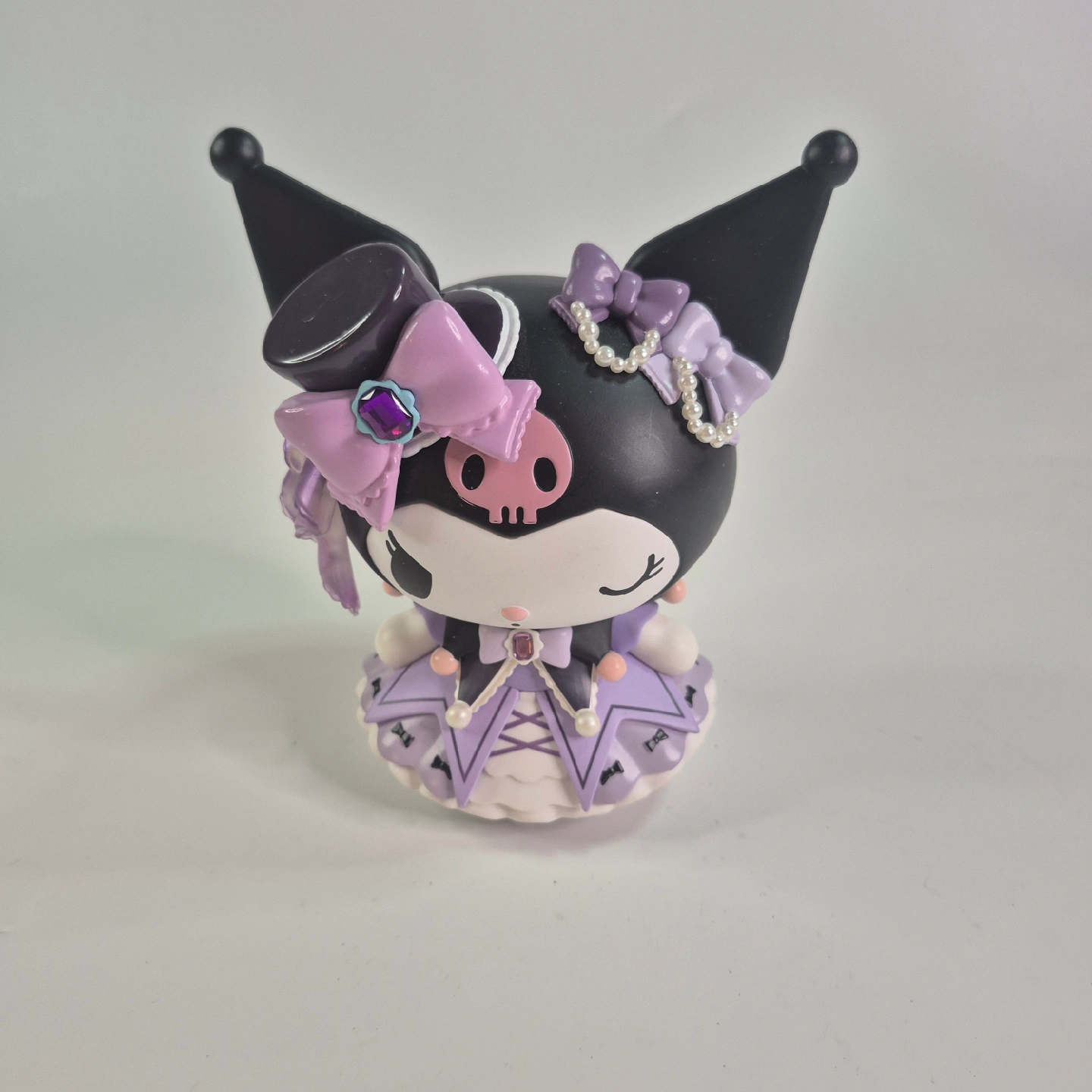 A cute Kuromi figurine! It's in great condition and would look great on a shelf or desk. The figurine is black and has a purple dress and bow. It also has a top hat with a jewel on it