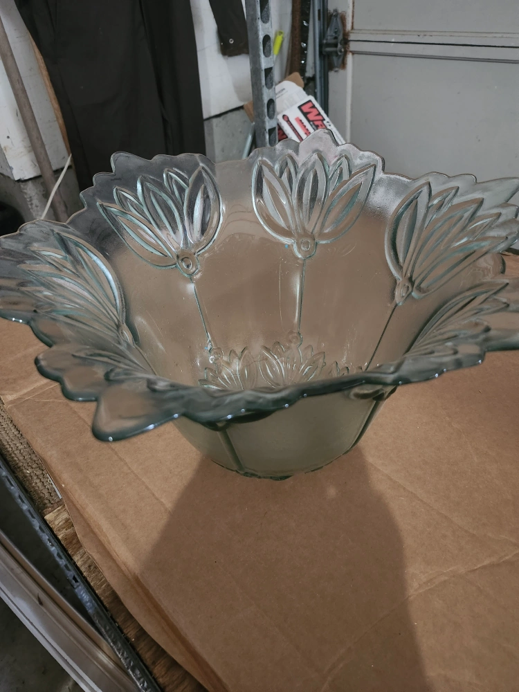 Selling a lovely glass bowl with a floral design around the rim. It's in great condition and would look beautiful as a centrepiece or for serving. Perfect for adding a touch of elegance to your home!